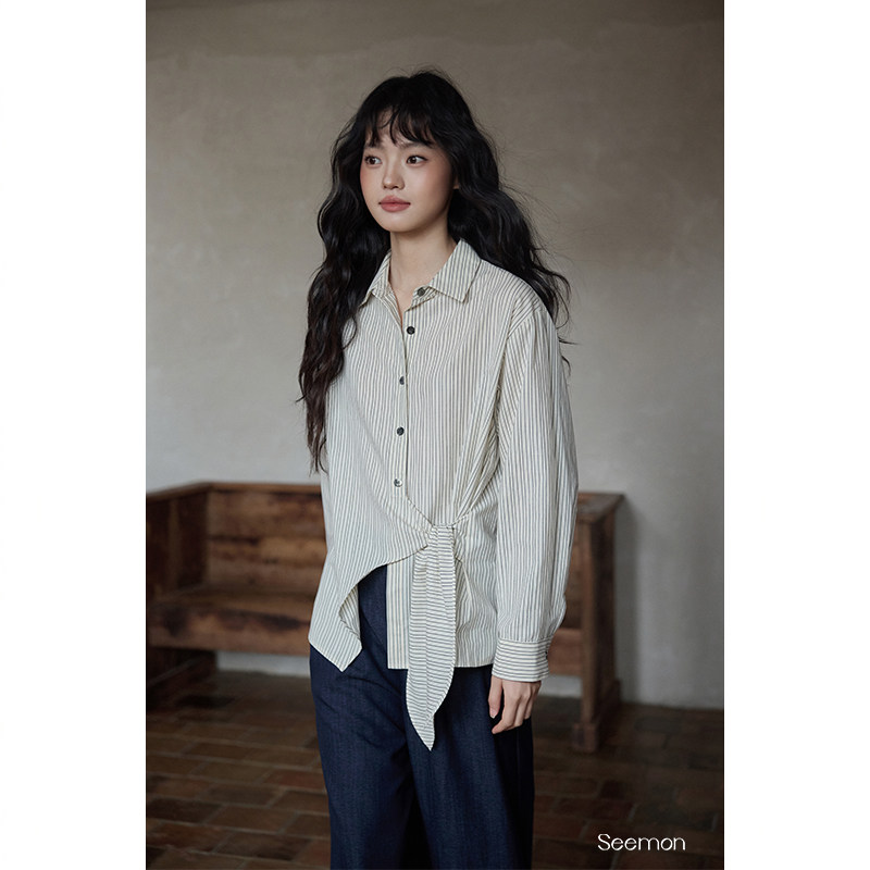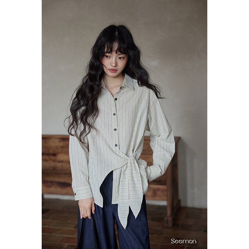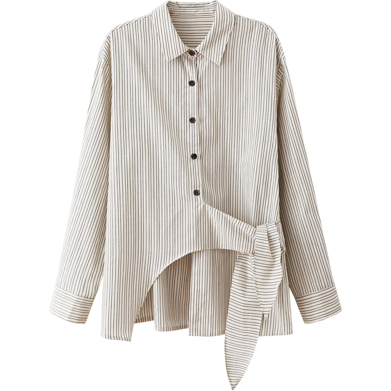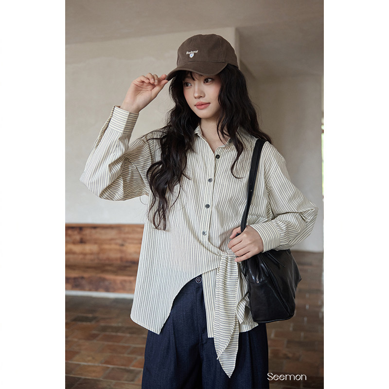 夕蒙2025新款秋韩系气质上衣小个子 独特漂亮小衫杏色条纹衬衫女