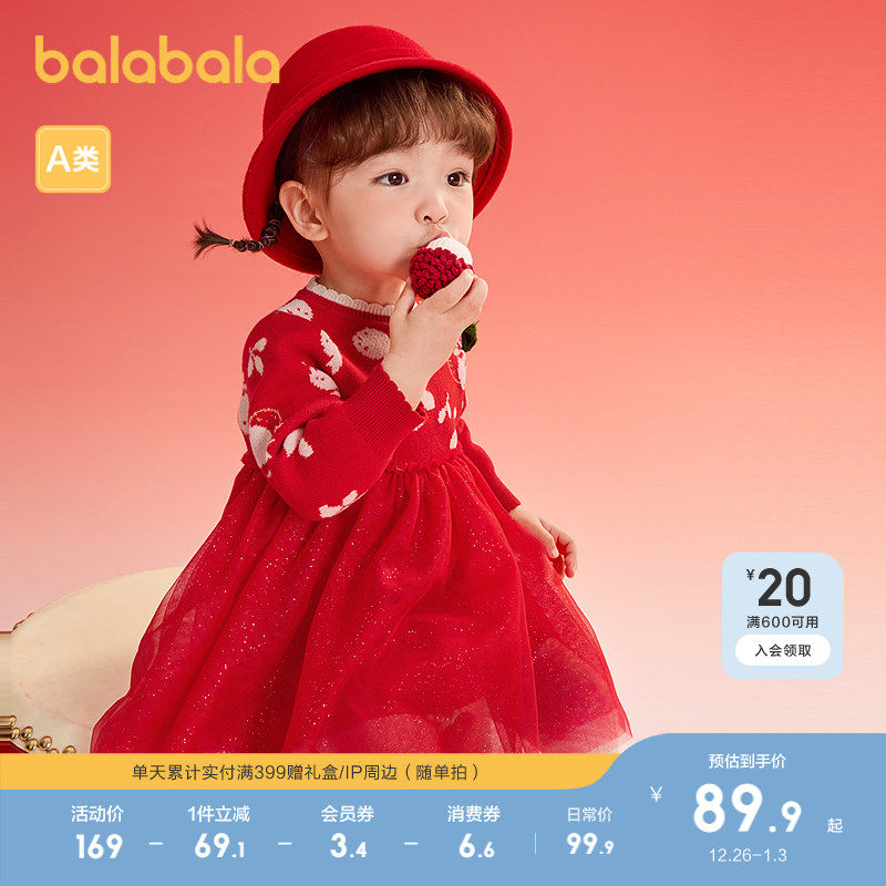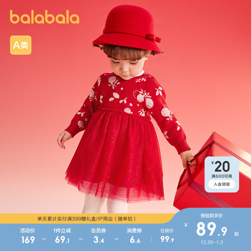 巴拉巴拉童装婴儿女童连衣裙2025春秋新款红色拜年服甜美针织裙子