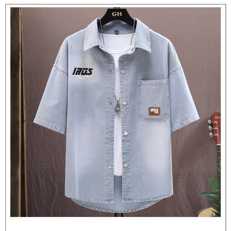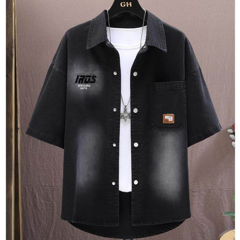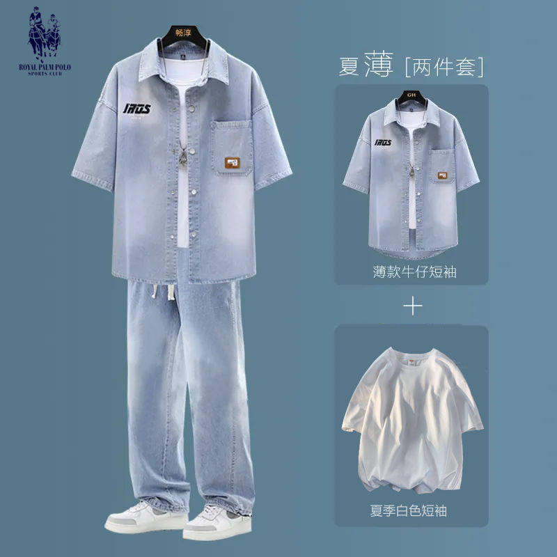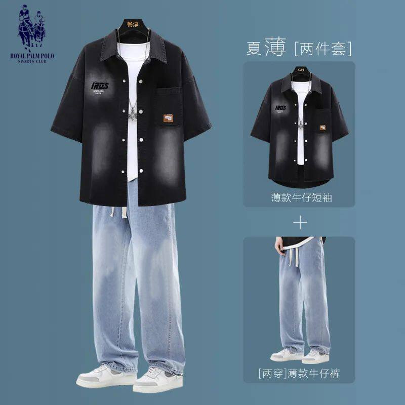 青少年男装衬衣套装痞帅宽松休闲夏季短袖牛仔衬衫学生百搭外套