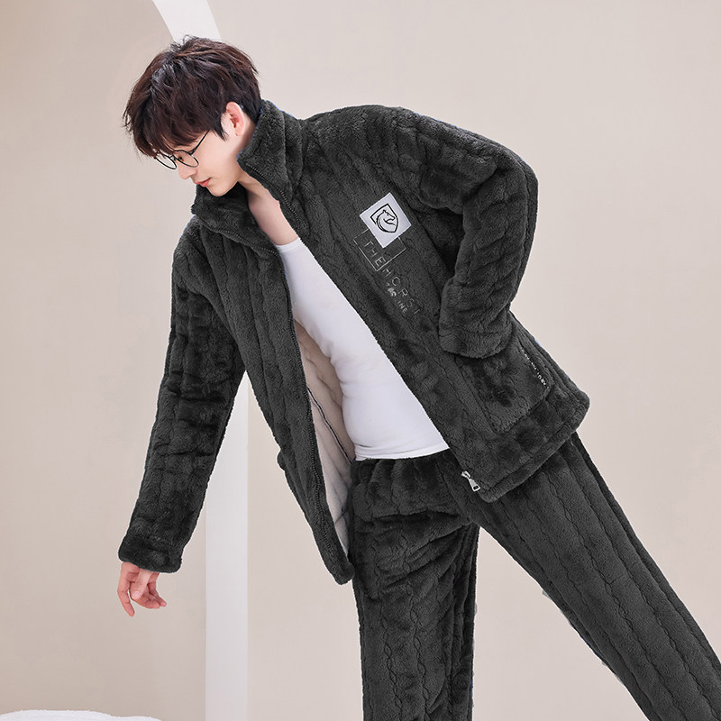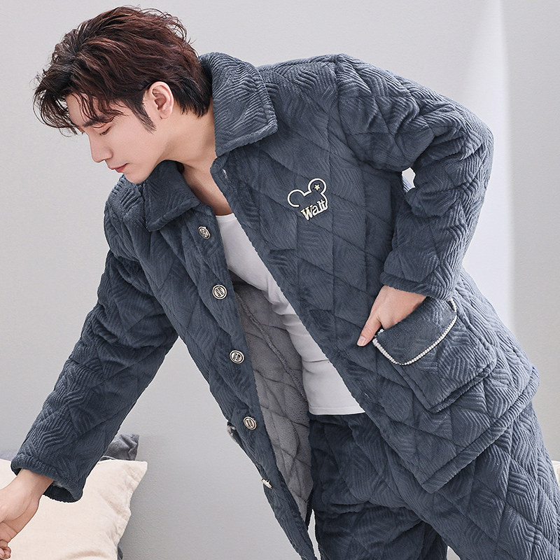 秋冬季珊瑚绒男士睡衣三层加厚加绒夹棉袄款家居服保暖套装可外穿