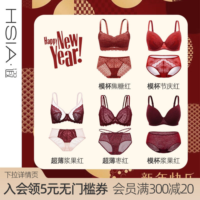 遐大胸显小文胸套装无痕新年送礼结婚新娘本命年酒红色内衣套装女