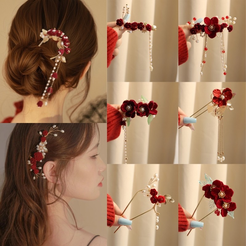 敬酒服头饰马面裙发簪订婚新娘红色u型发夹新中式旗袍盘发侧边夹
