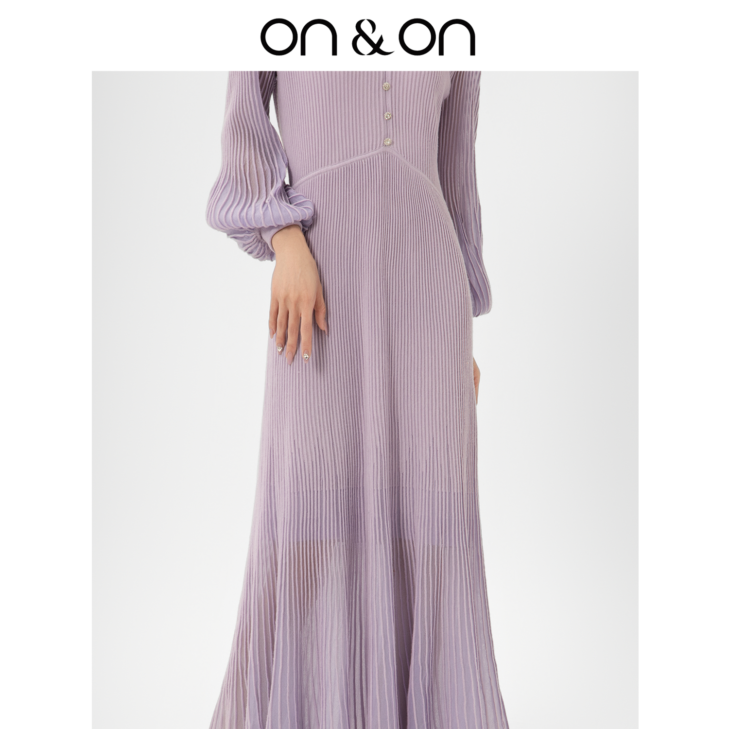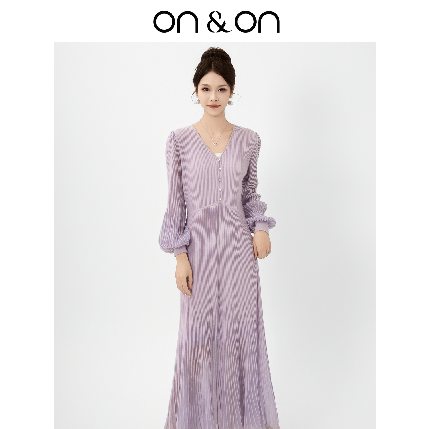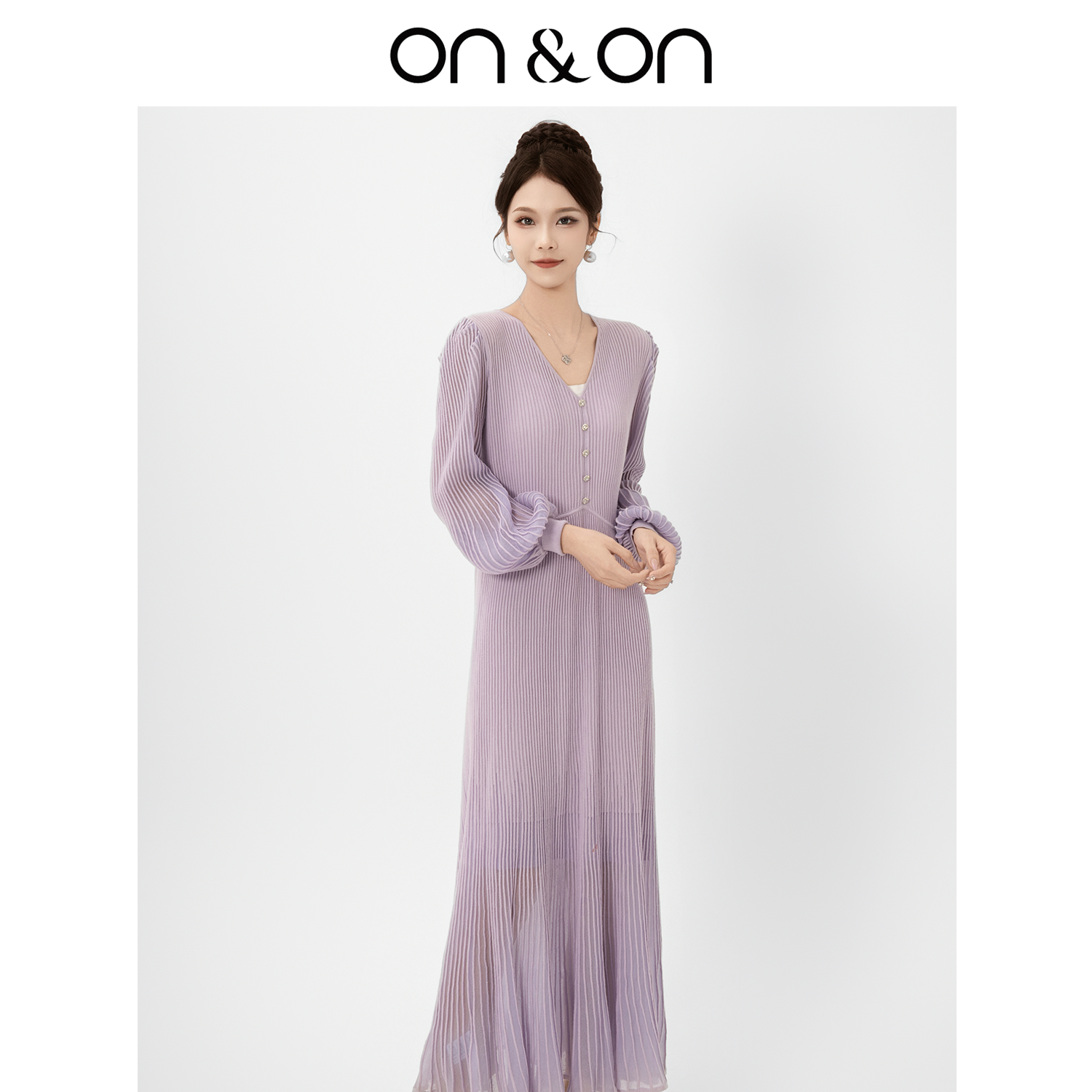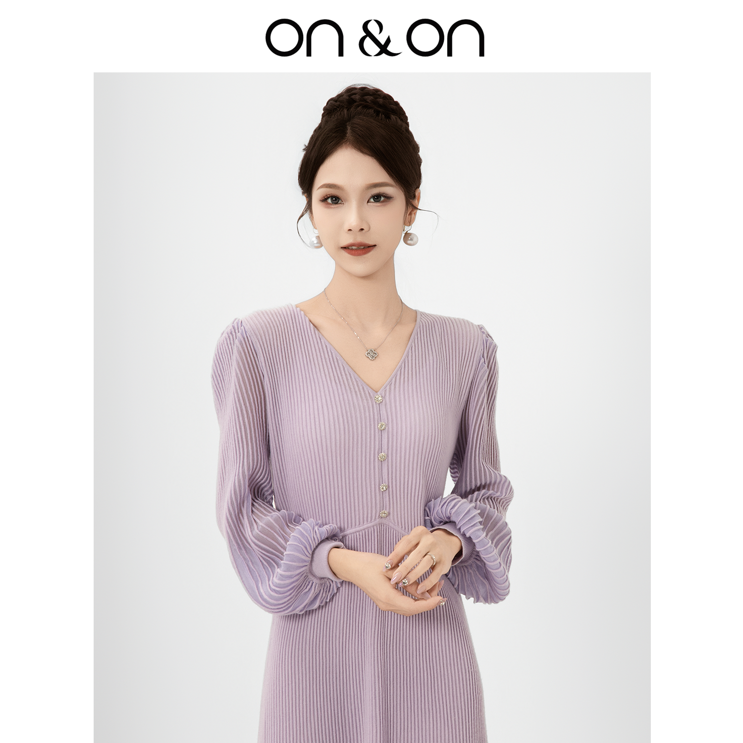 ON&ON/安乃安2025冬季新款韩系V领时尚百褶鱼尾长袖针织连衣裙女