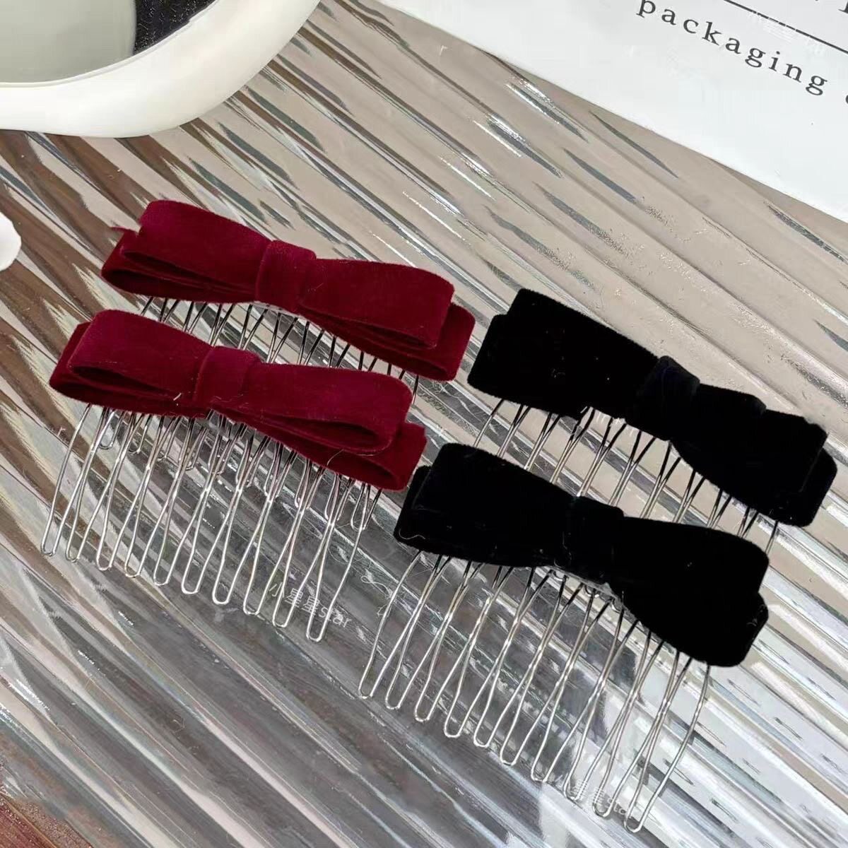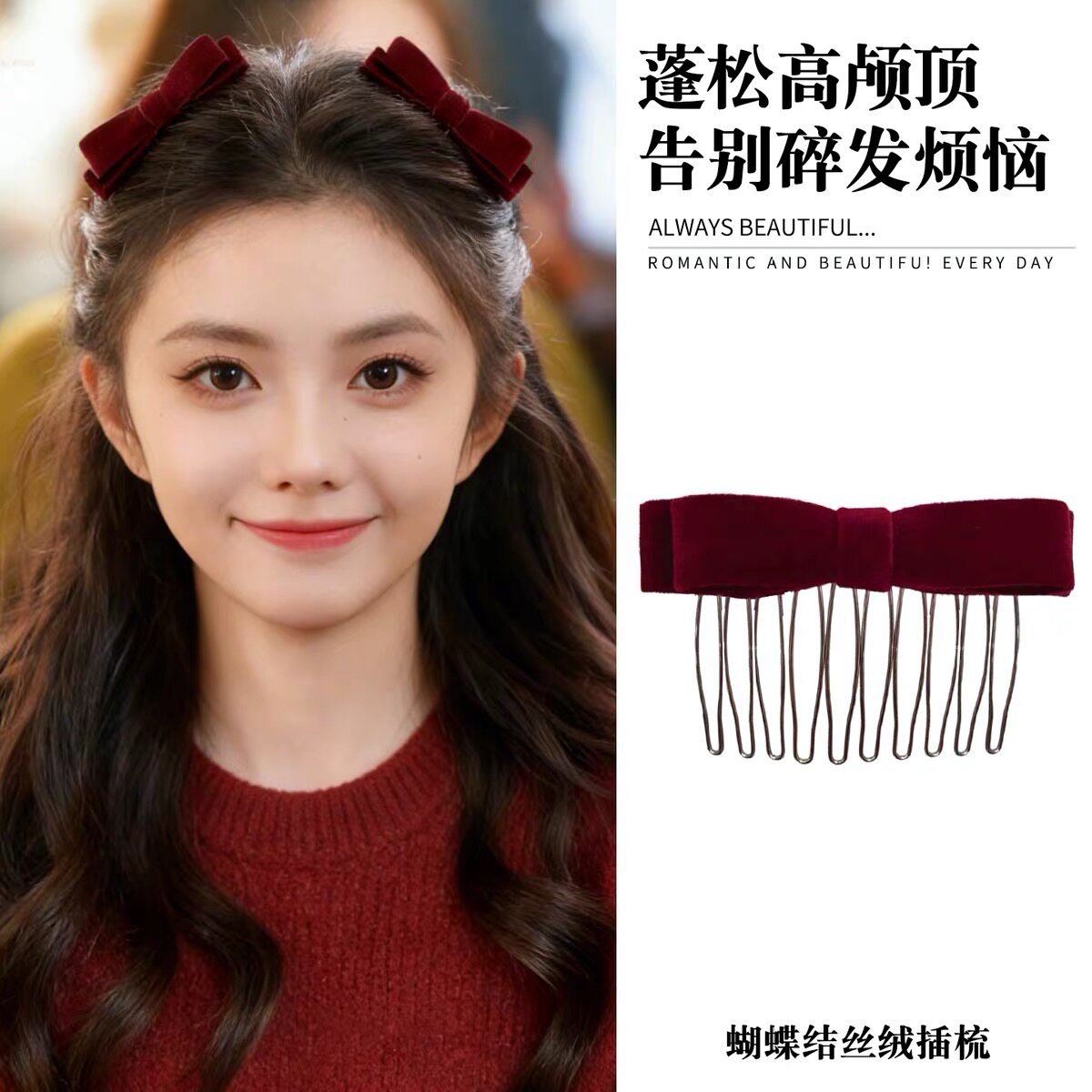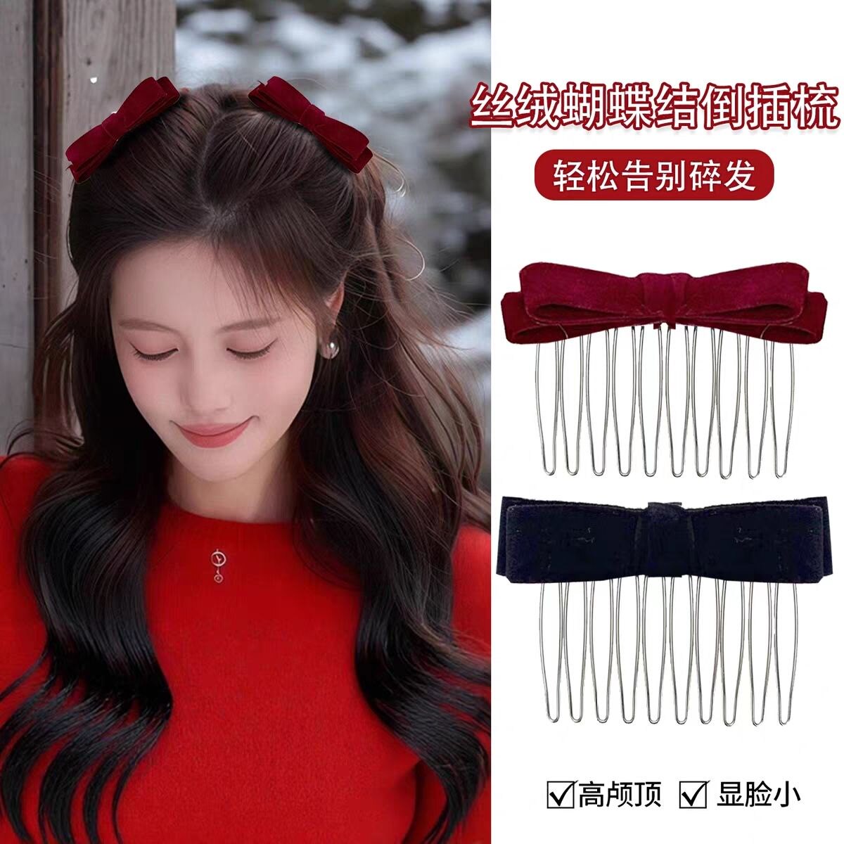 新年红发卡头饰发梳双层蝴蝶结倒插梳金丝绒复古超仙侧边刘海夹女