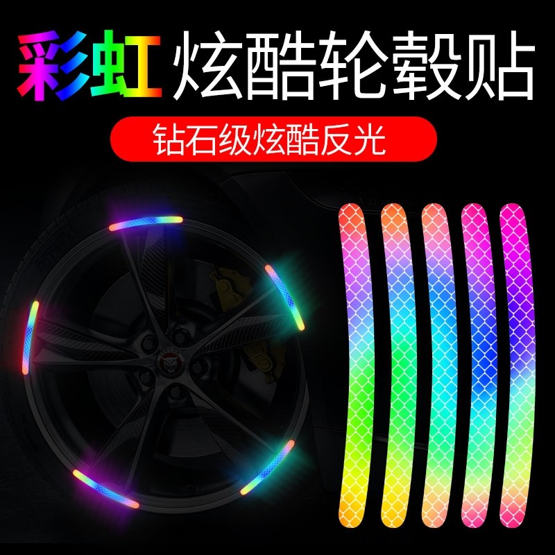 汽车轮毂反光贴个性创意炫彩轮胎警示贴纸电动车彩虹夜光装饰车贴