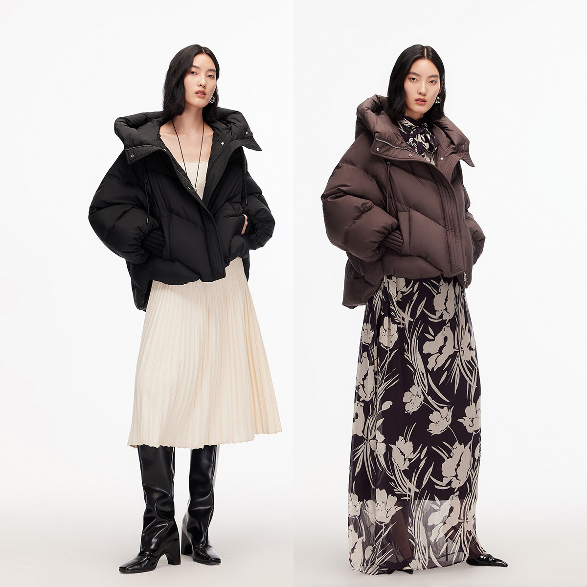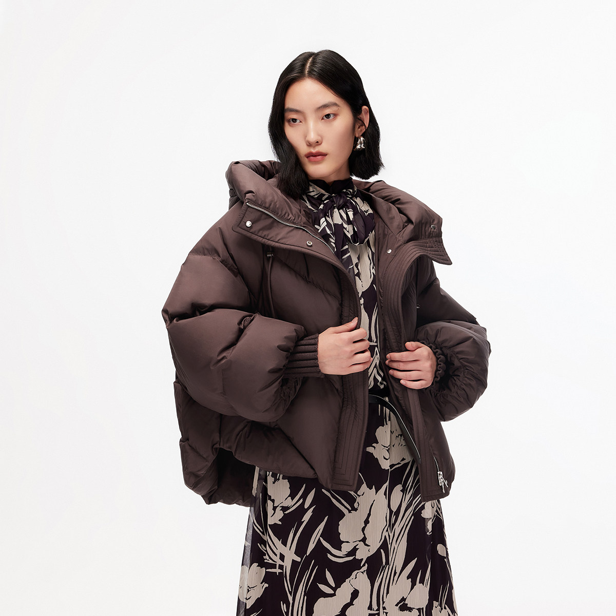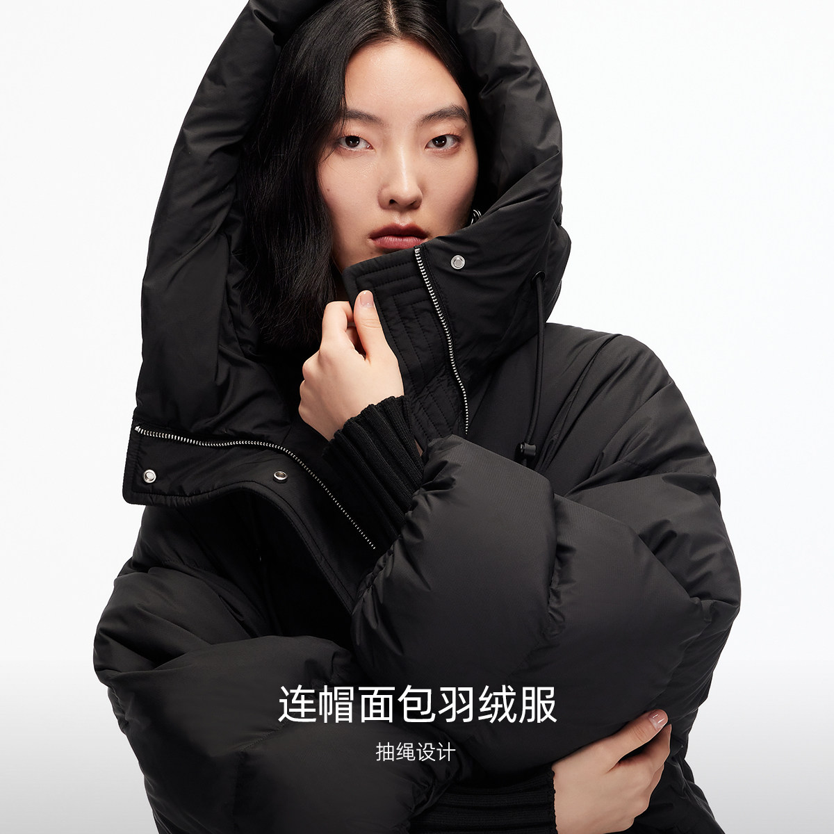 连帽面包羽绒服,抽绳设计;立体廓形,