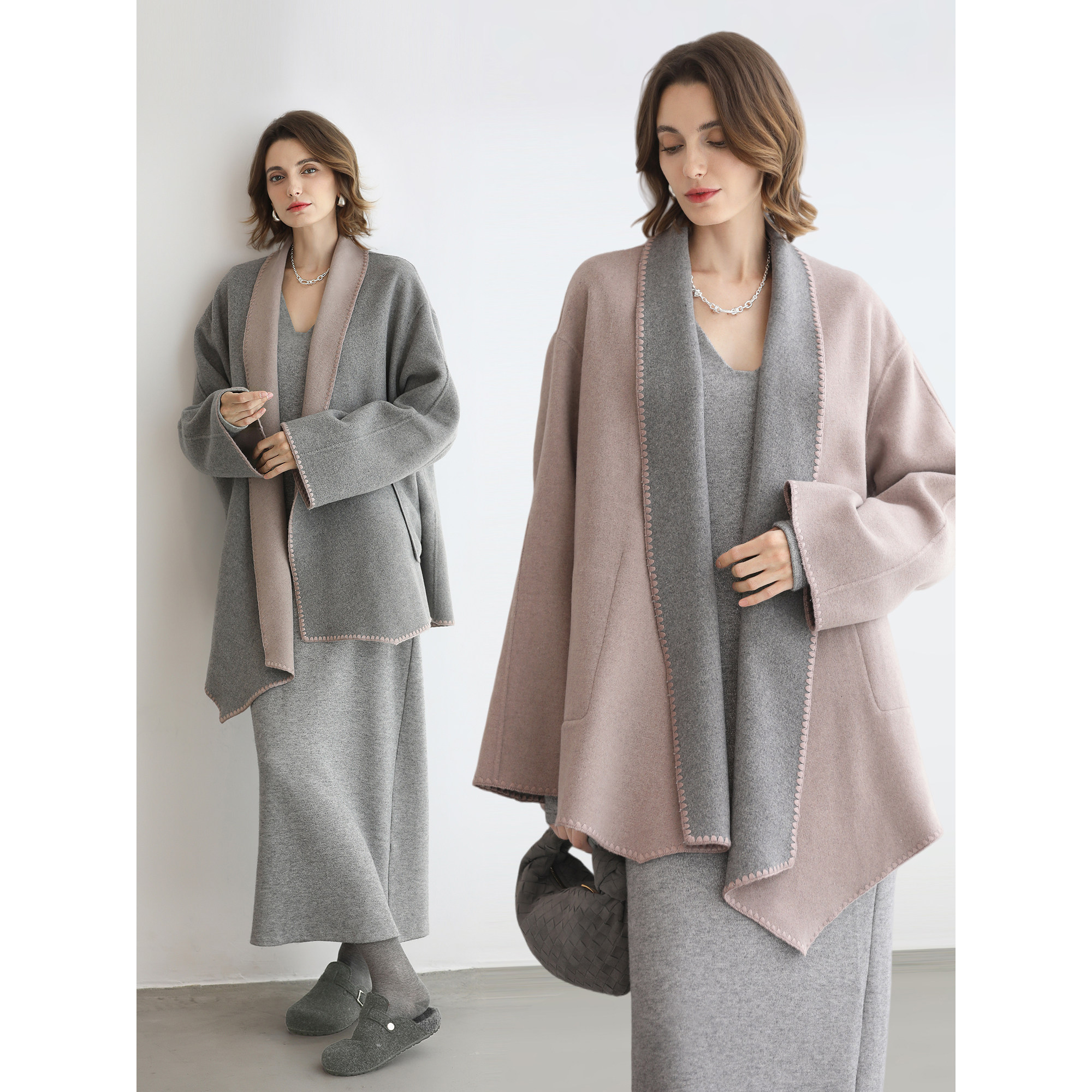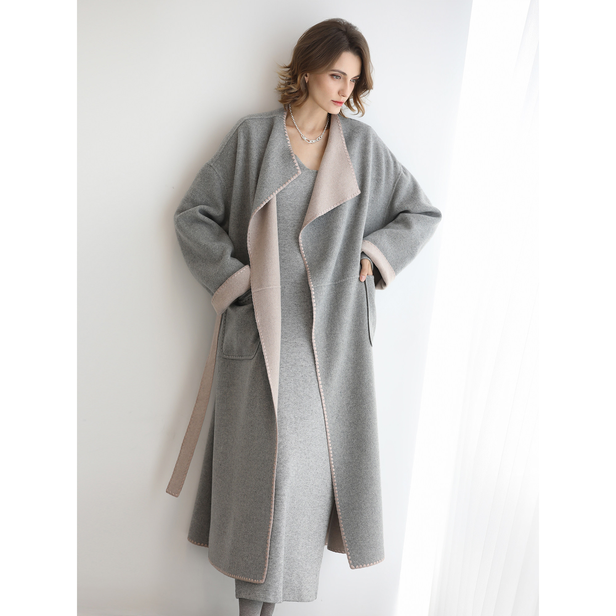 预售COCOBELLA气质V领灰色休闲连衣裙女秋冬通勤针织长裙FR3242-3
