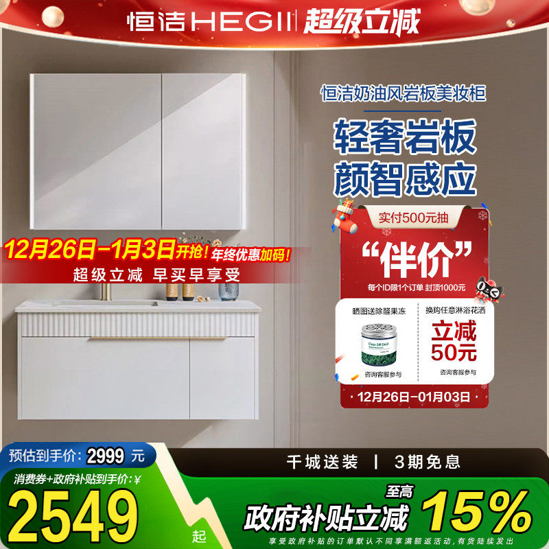恒洁奶油风岩板浴室柜简约欧式法式多层实木美妆收纳感应智能6162