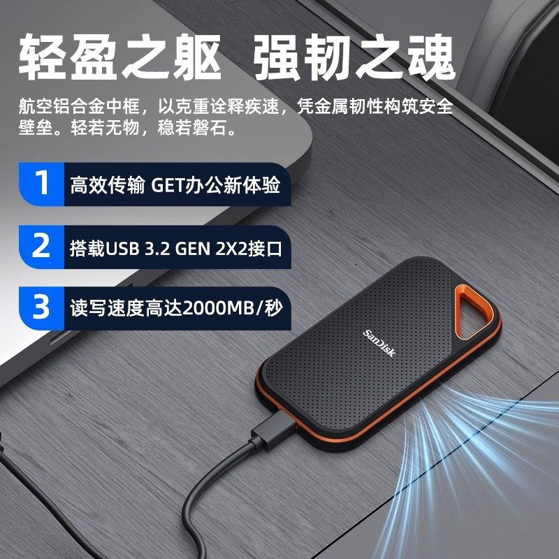闪迪E61固态移动硬盘2t三防便携ssd外接1tb大容量手机电脑两用