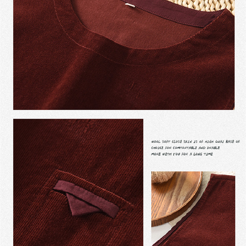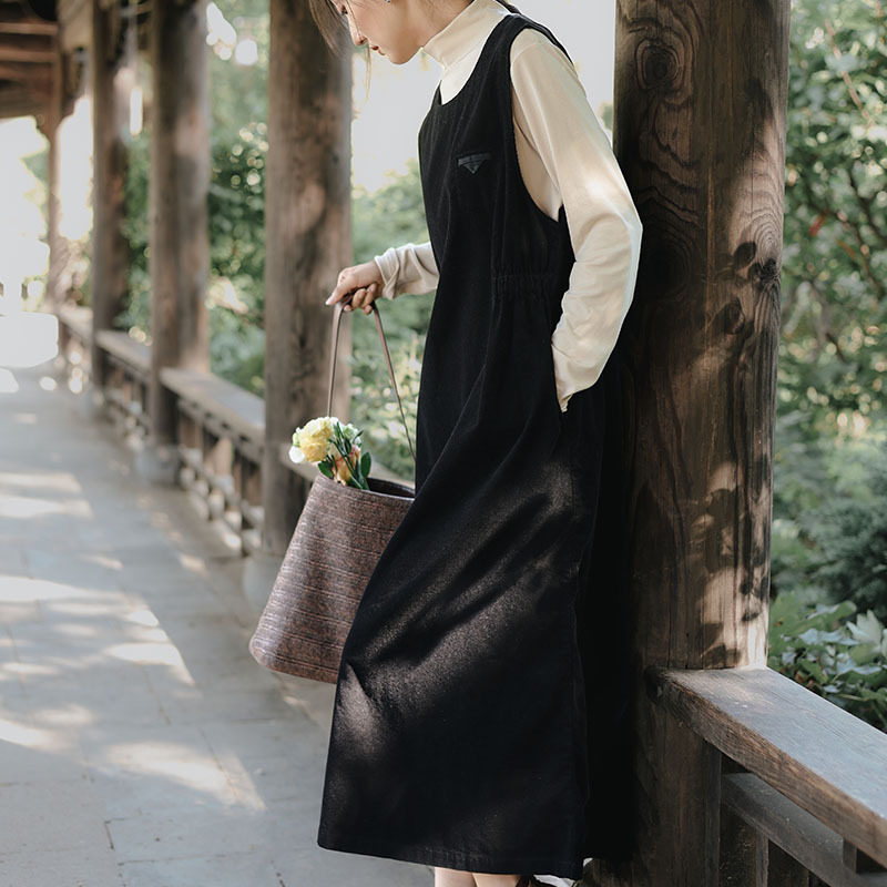 秋冬新款灯芯绒无袖过膝连衣裙圆领收腰气质条绒长裙灯草绒马夹裙
