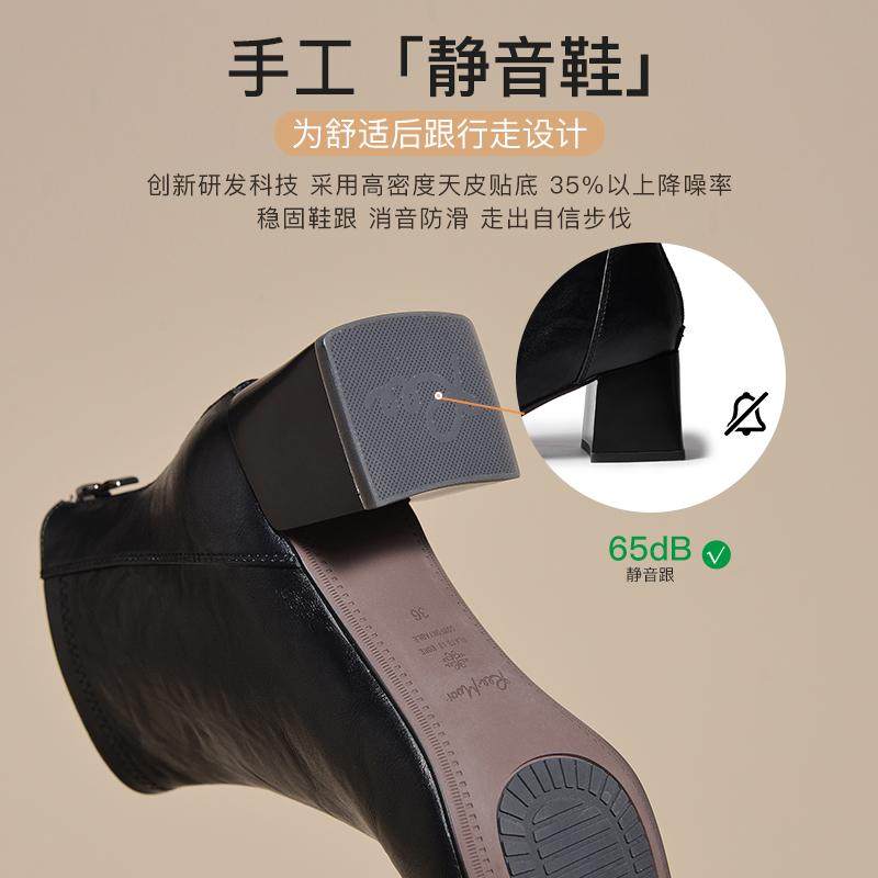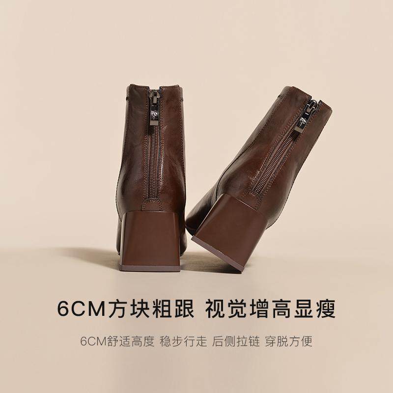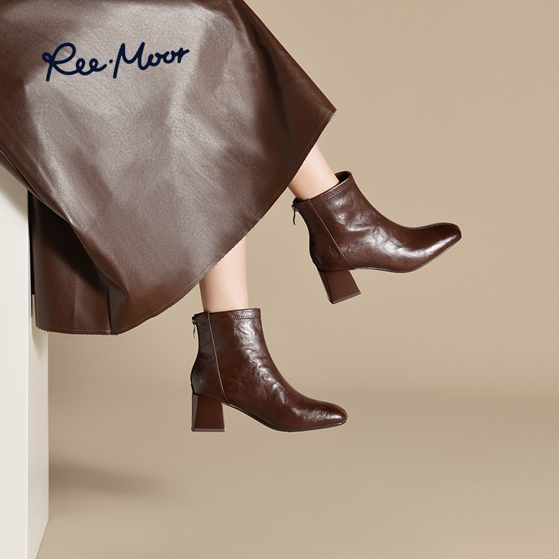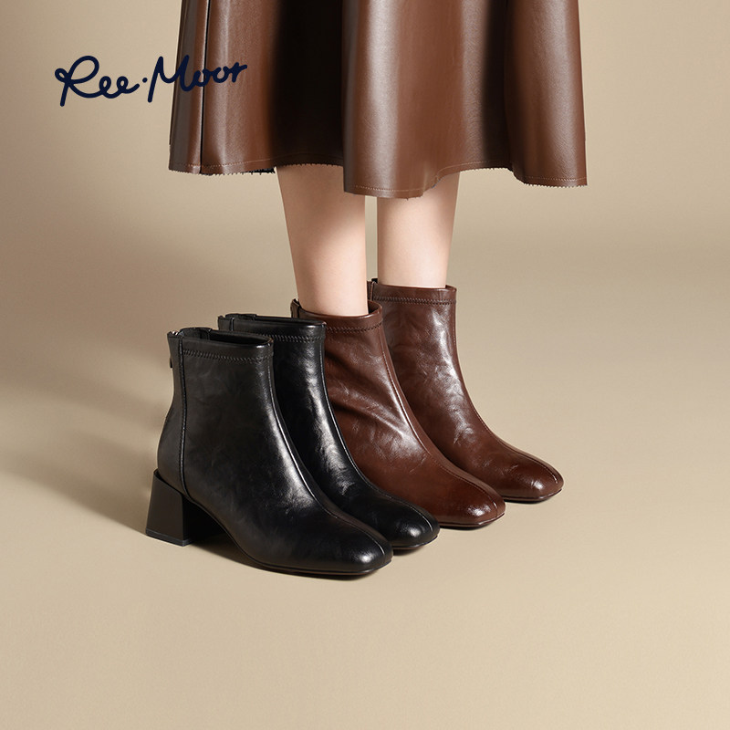 REEMOOR睿慕2025新款法式粗跟瘦瘦靴后拉链时装靴加绒高跟短靴女