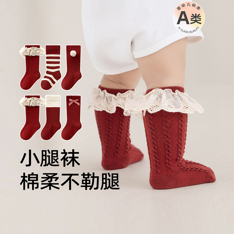 婴儿小腿袜春秋季宝宝松口无骨中筒袜女童百天周岁大红色新年棉袜