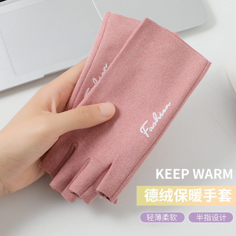 半指手套女冬季德绒情侣薄款半截露指学生写字加绒保暖发热轻薄