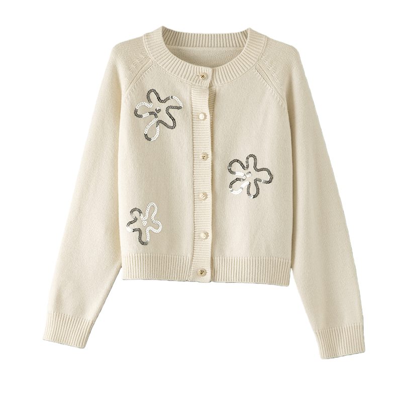 晚白2026年春季新款亮片圆领大码毛衣软糯亲肤宽松百搭针织开衫女