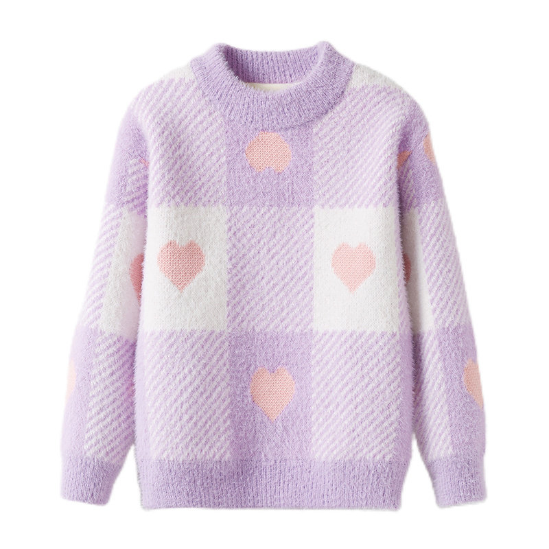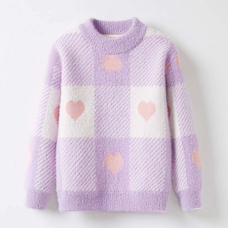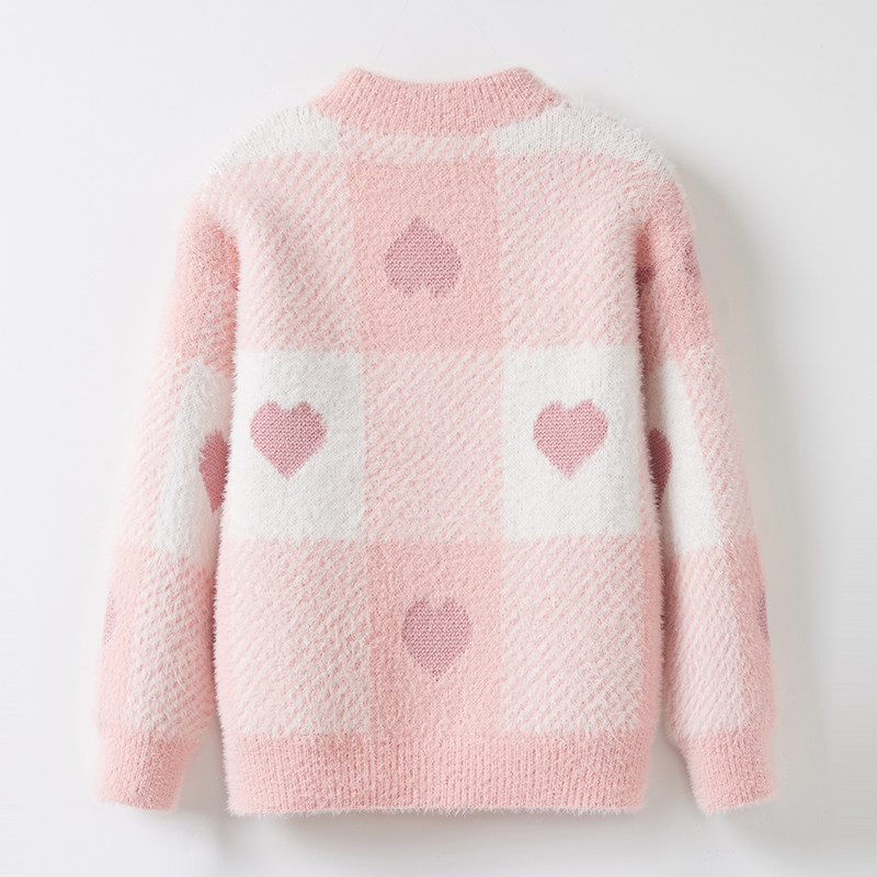 女孩秋冬款防水貂绒针织衫毛衣女童爱心加绒加厚圆领套头儿童打底