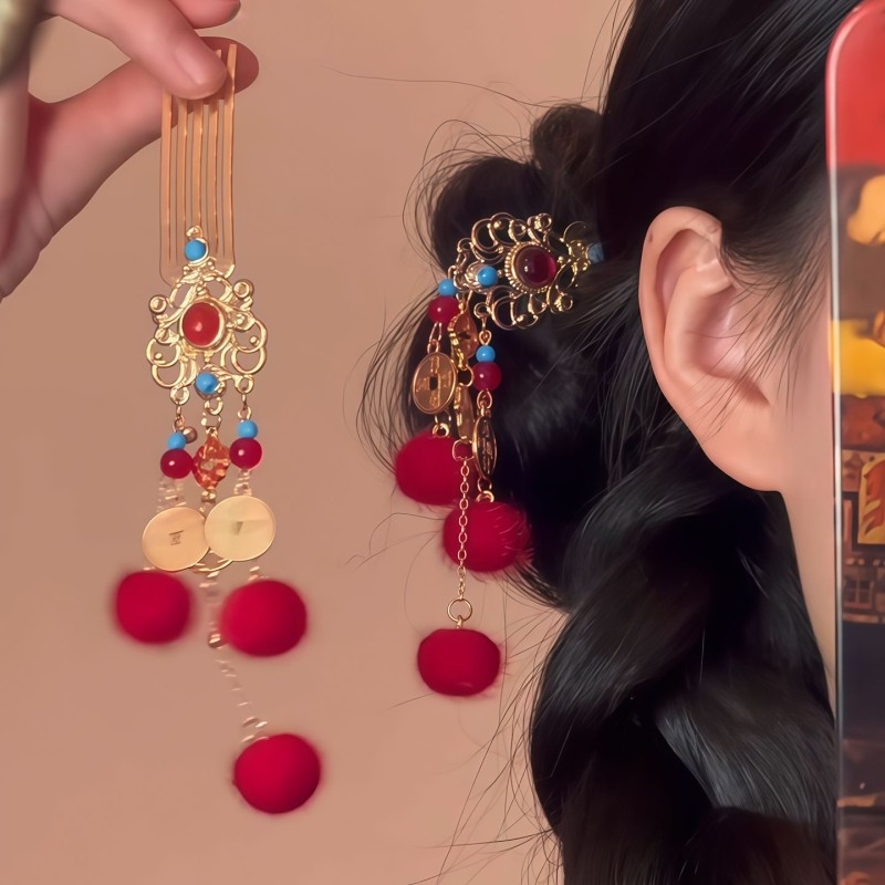 新年红色古风铜钱毛球国风流苏发簪新中式盘发步过年喜庆发钗发饰