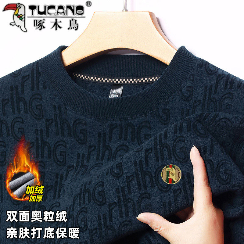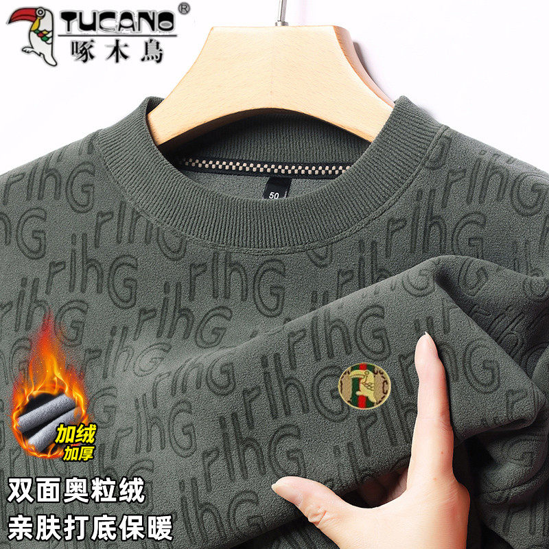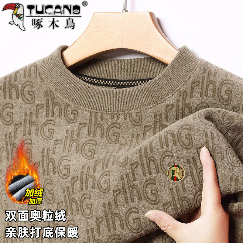 啄木鸟男士提花圆领卫衣冬季加绒加厚保暖内搭上衣男奥粒绒t恤衫