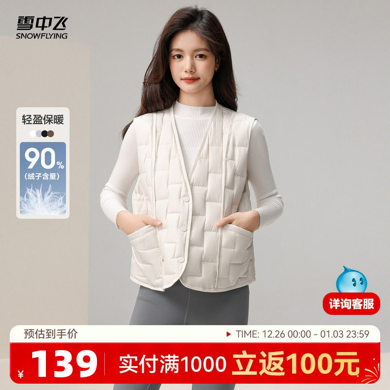 雪中飞2025春秋新款女士短款V领羽绒马甲编织格设计休闲居家温柔