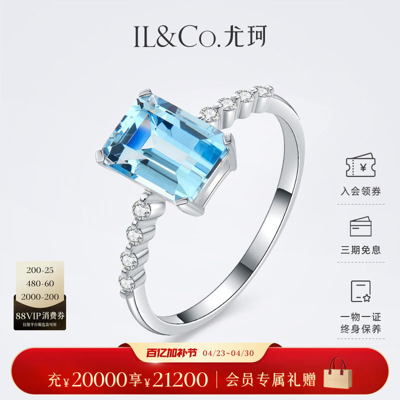 ILCO尤珂「冰蓝方糖」18K金天然海蓝宝石戒指时尚方形彩宝女款戒