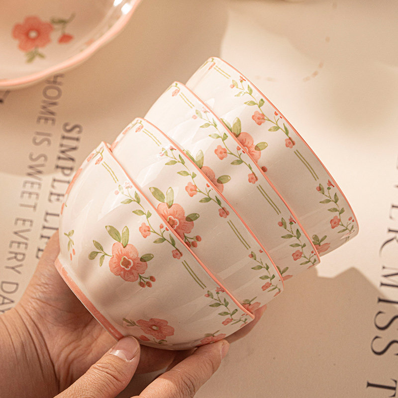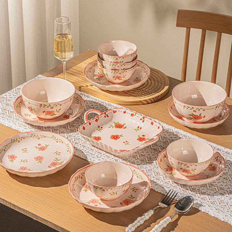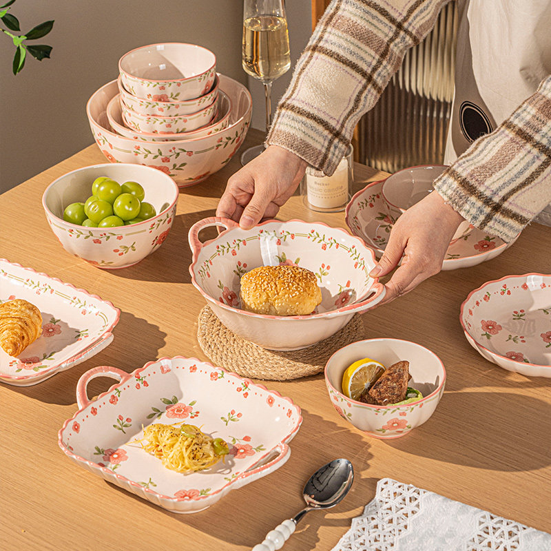 奶油风陶瓷碗家用卡通菜盘子可爱米饭碗汤碗釉下彩儿童餐具耐高温