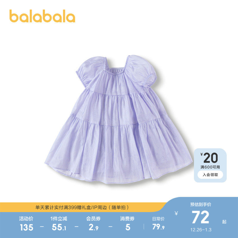 巴拉巴拉童装女童连衣裙泡泡袖裙子夏季儿童A字裙子方领时尚百搭