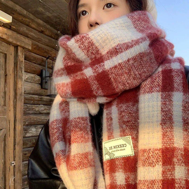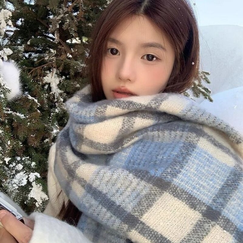 格子马海毛围巾秋冬季韩系加厚氛围保暖新款学生围脖白色不掉毛