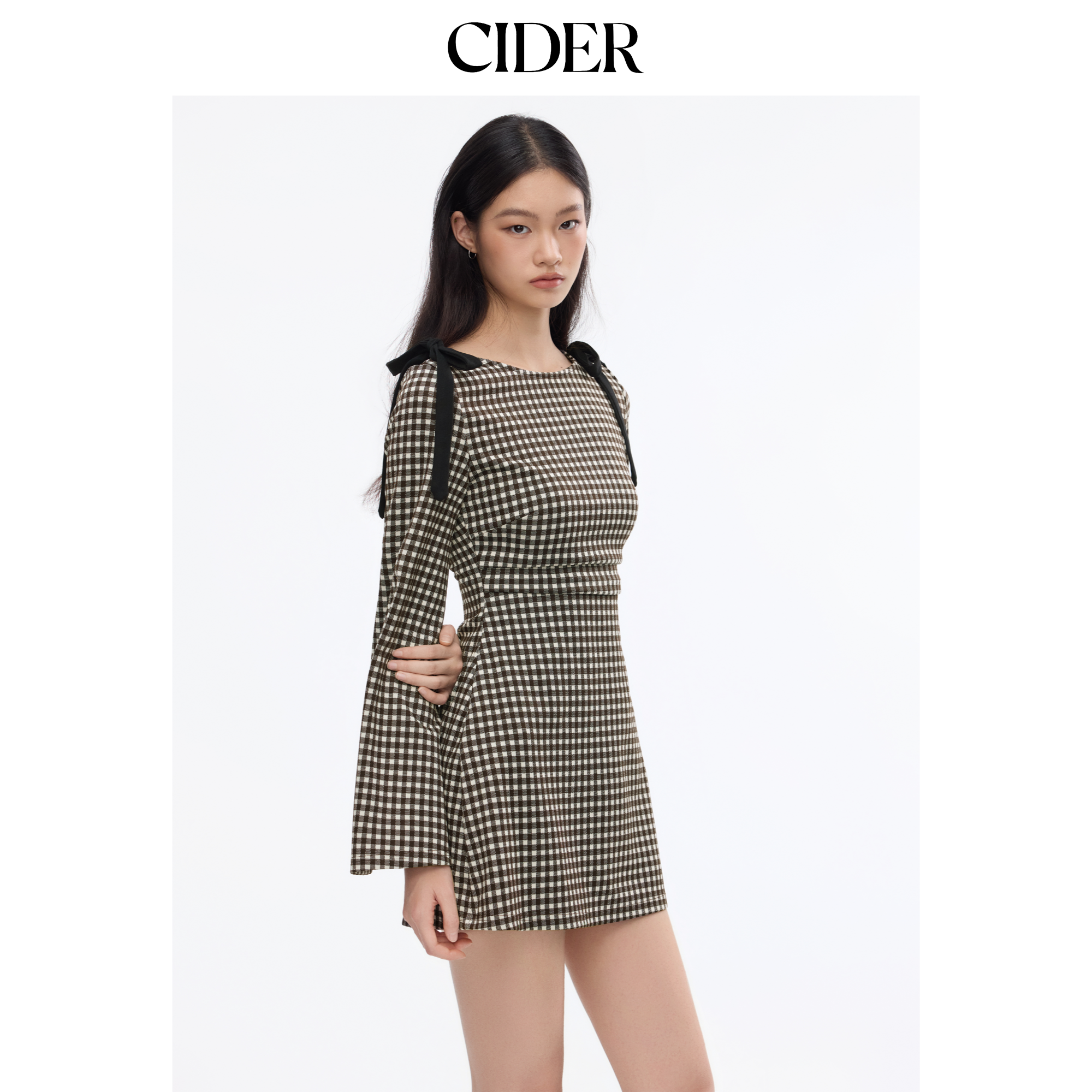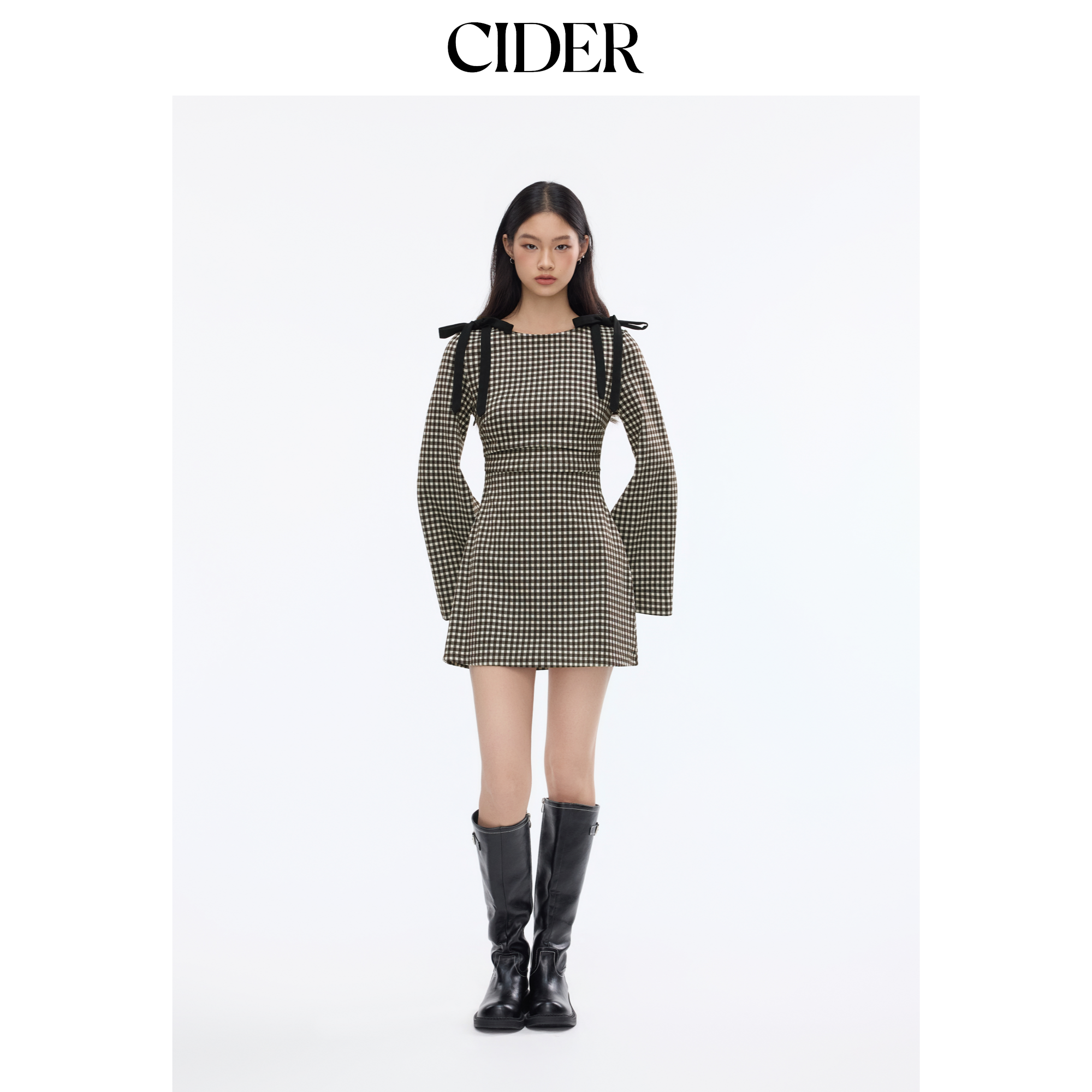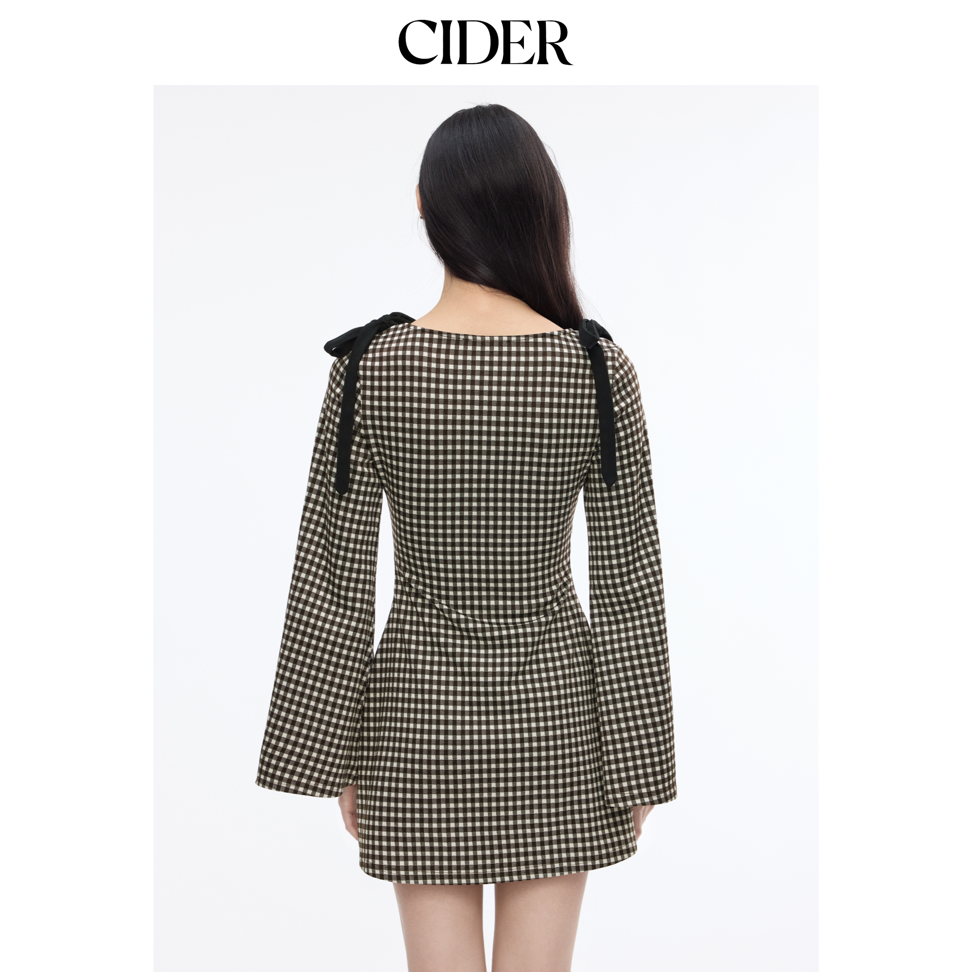 CIDER棉法式船领格纹蝴蝶结褶皱圆领连衣裙女装114164710