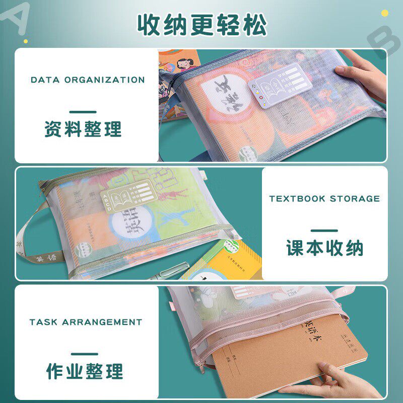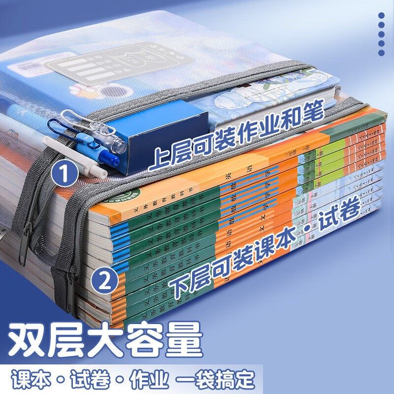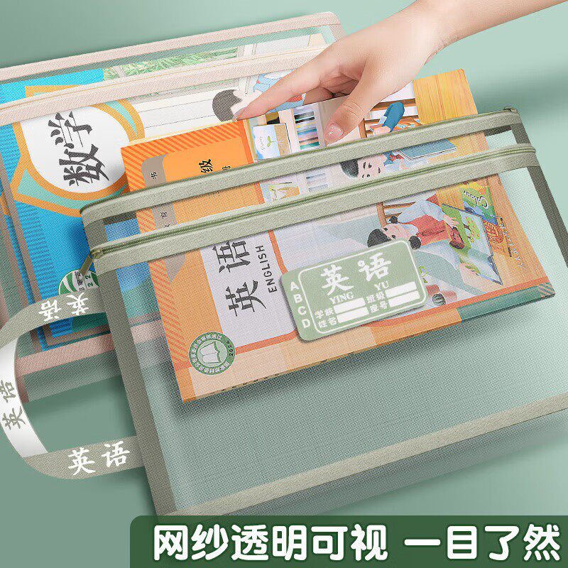 晨光文具学科科目分类袋小学生文件袋拉链式试卷收纳袋透明网纱双层大容量书袋作业资料a4考试专用袋票据产检