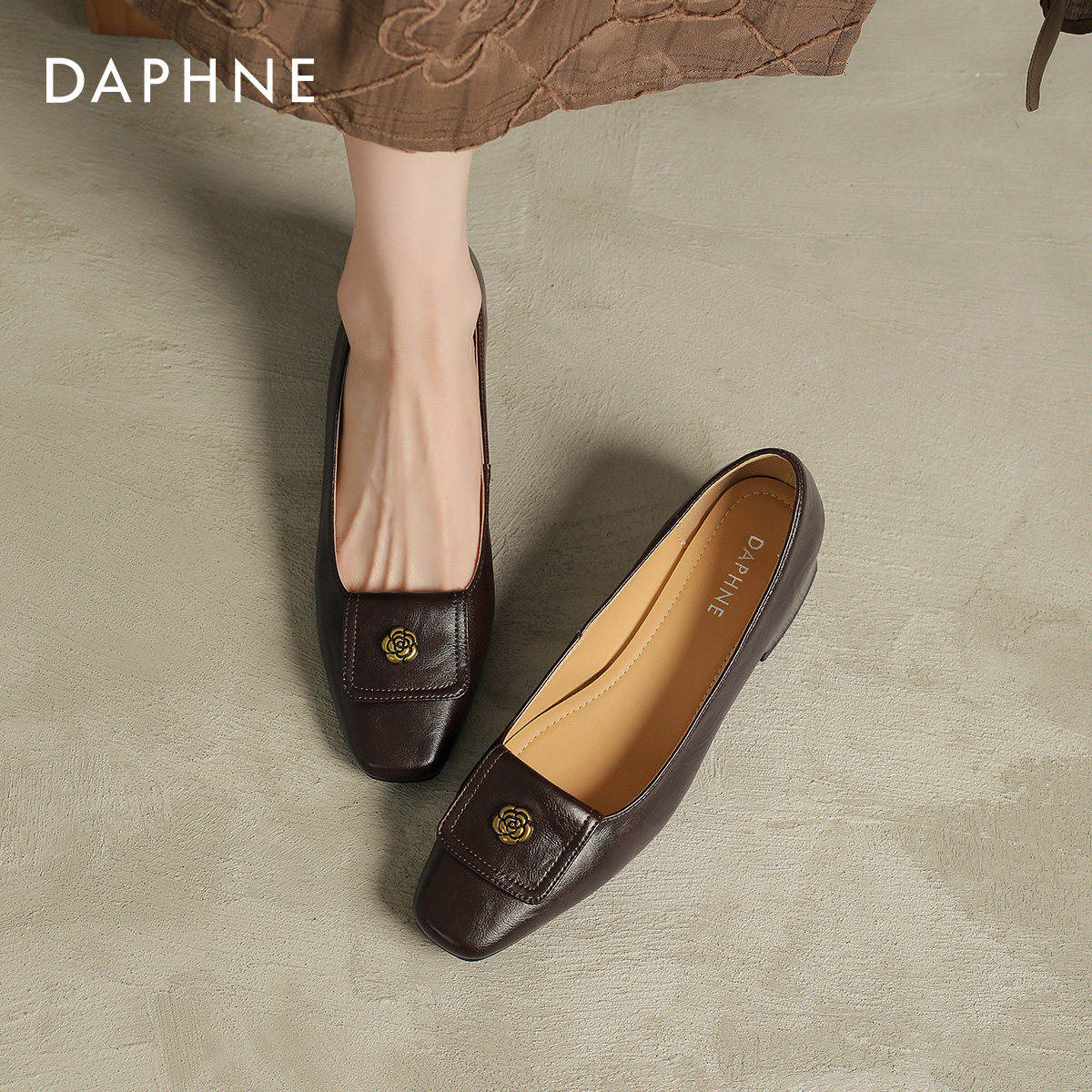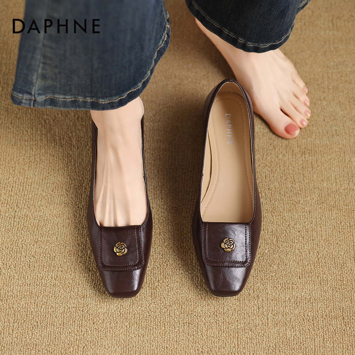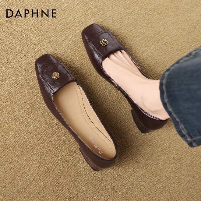 达芙妮浅口单鞋女2026新款法式复古山茶花通勤不累脚方头粗中跟鞋