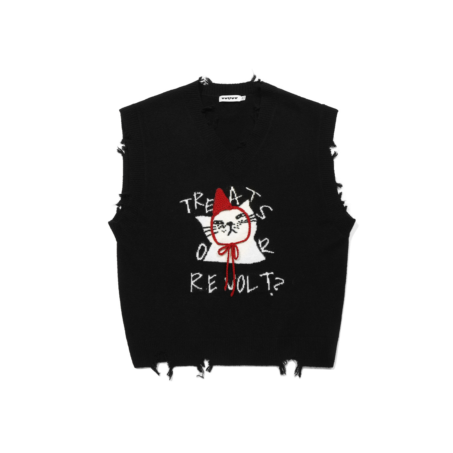 GUUKA潮牌黑色绵羊毛针织衫女小红帽猫咪V领毛衣背心坎肩磨破马甲