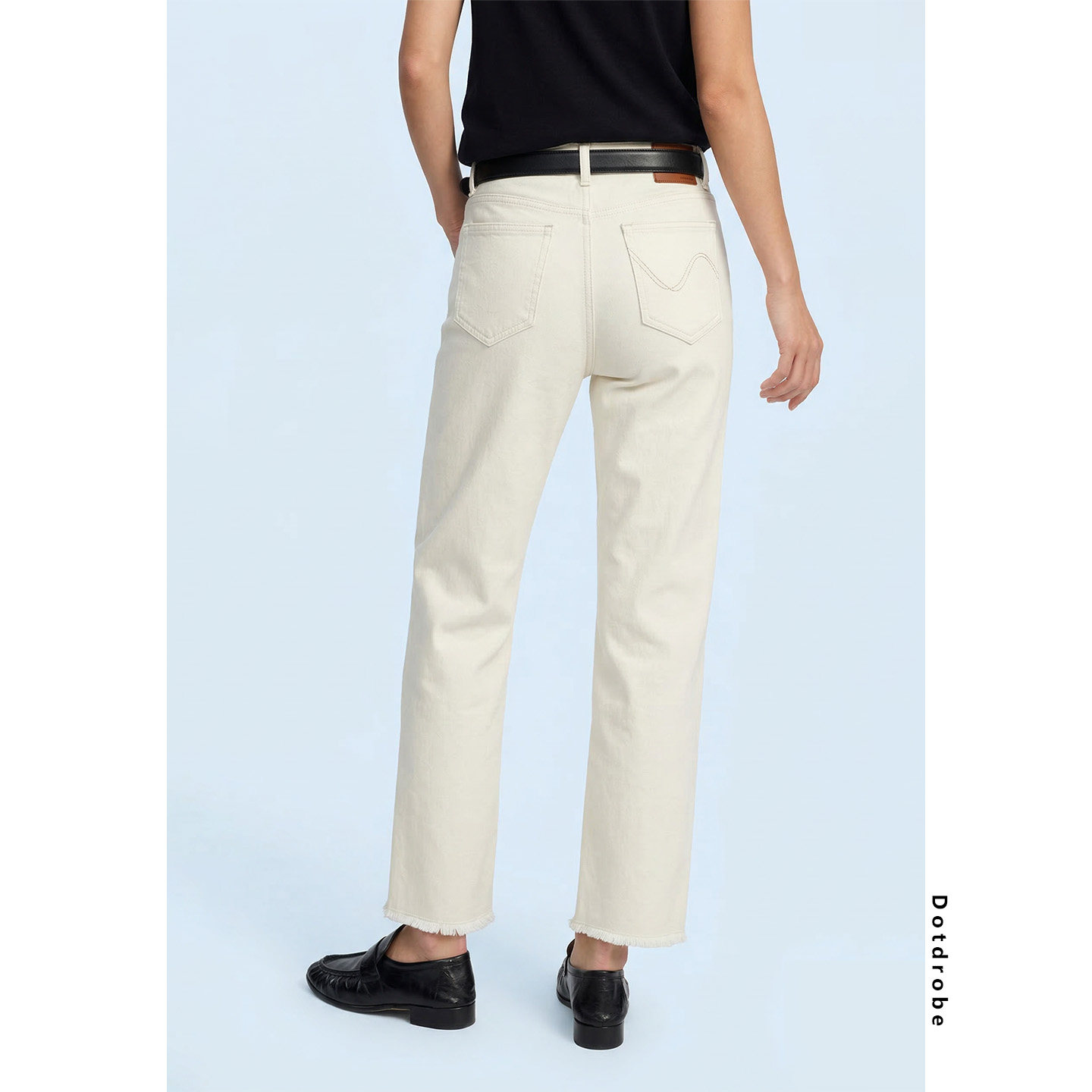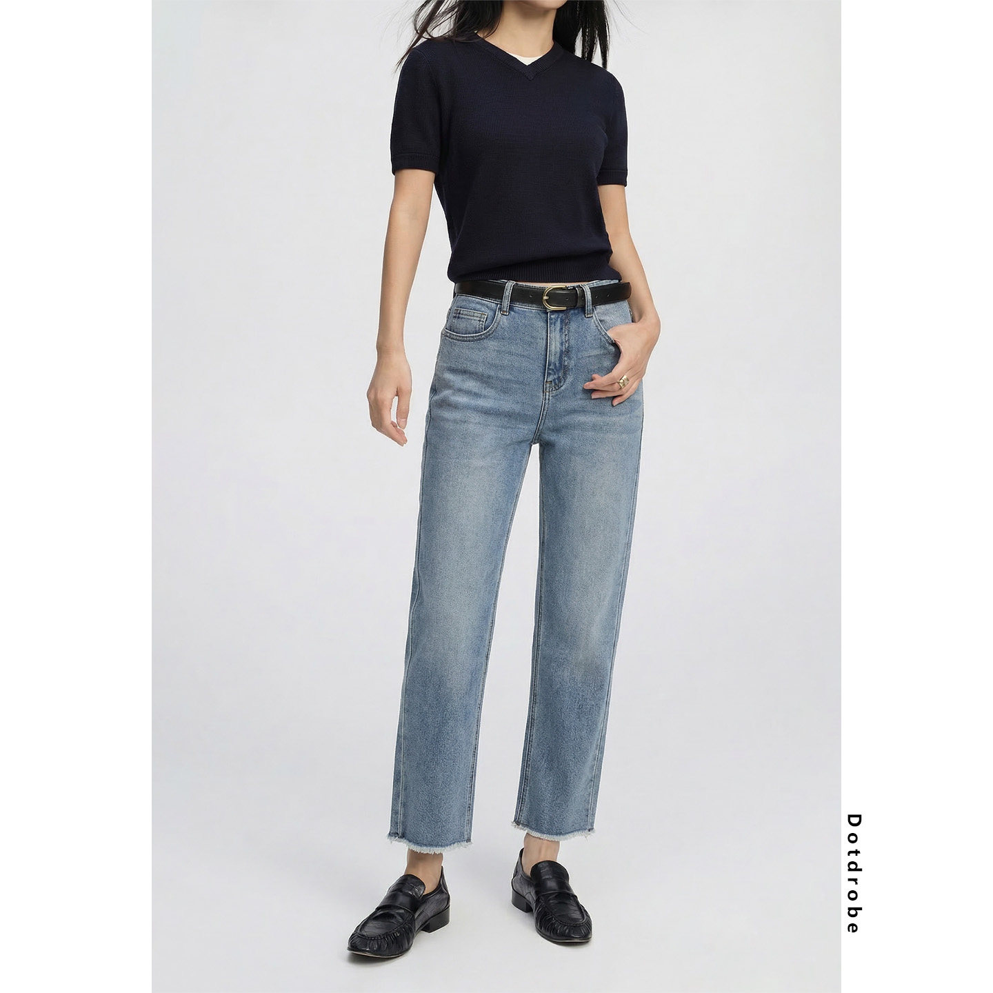 Dotdrobe多着 莱卡双芯结构弹力面料毛边法棍牛仔裤女显瘦显腿直