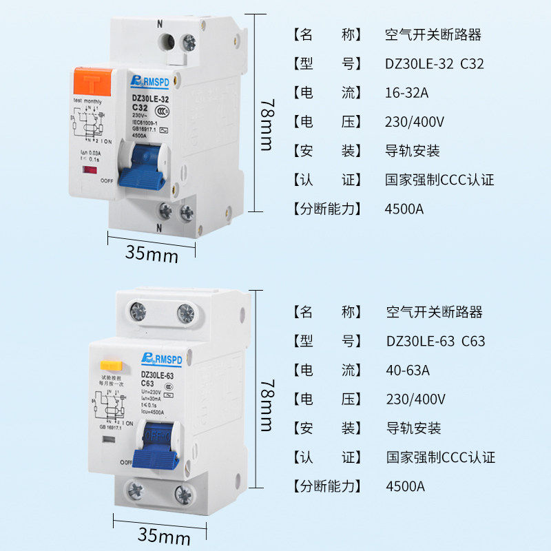德力西空气开关带漏电保护器2P63A家用漏保32a断路器空调空开220V