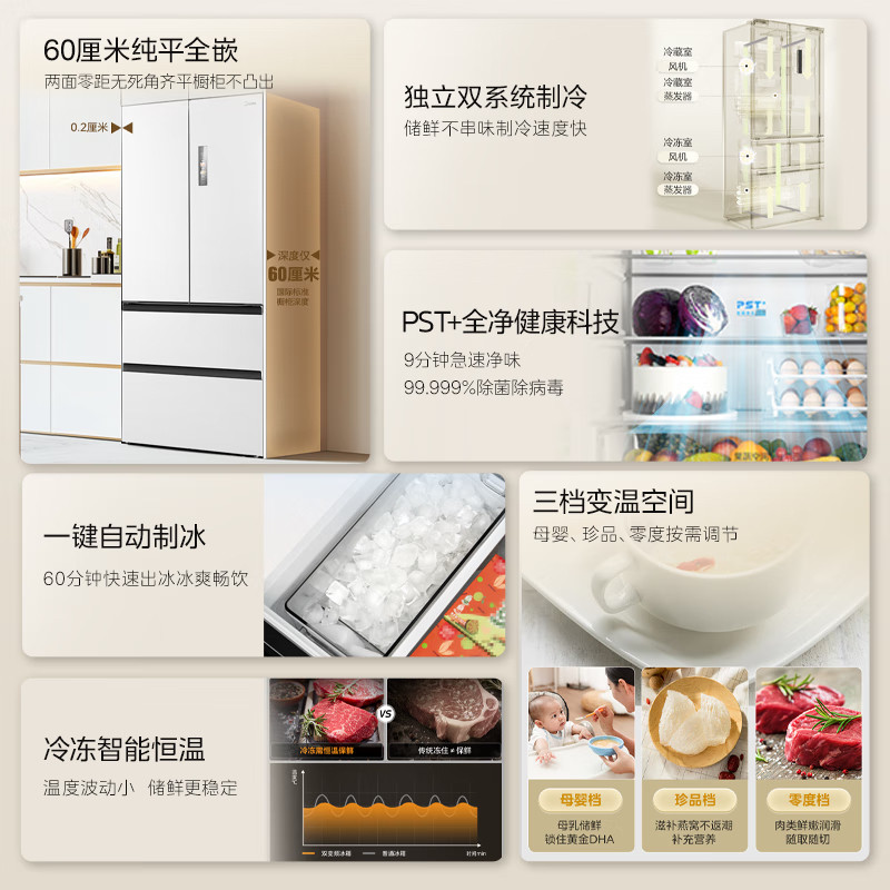双系统|美的M60小机皇520超薄零嵌入式冰箱家用法式多门四门双开