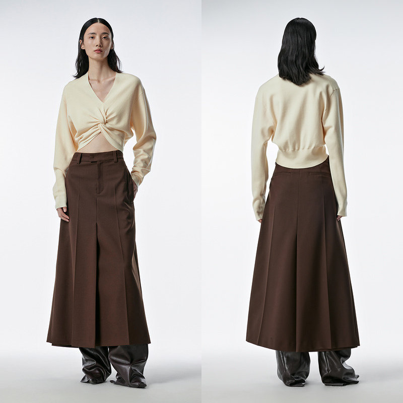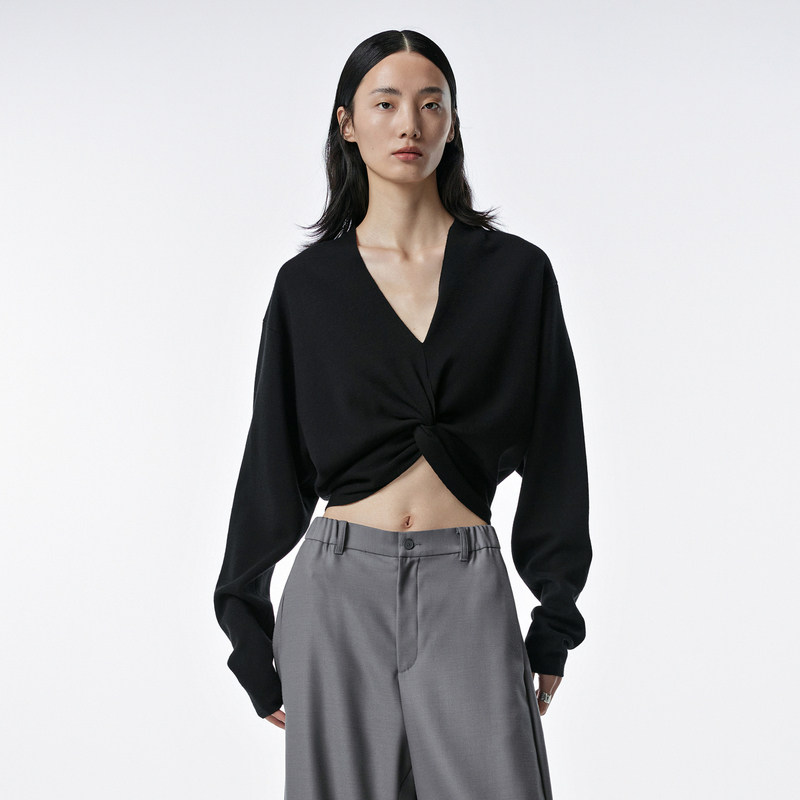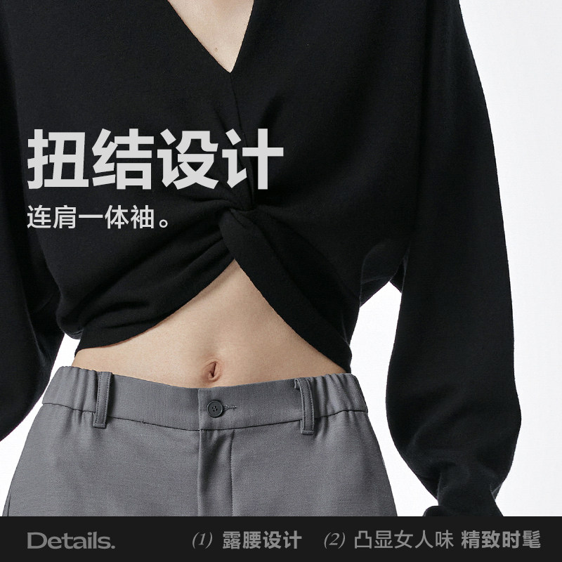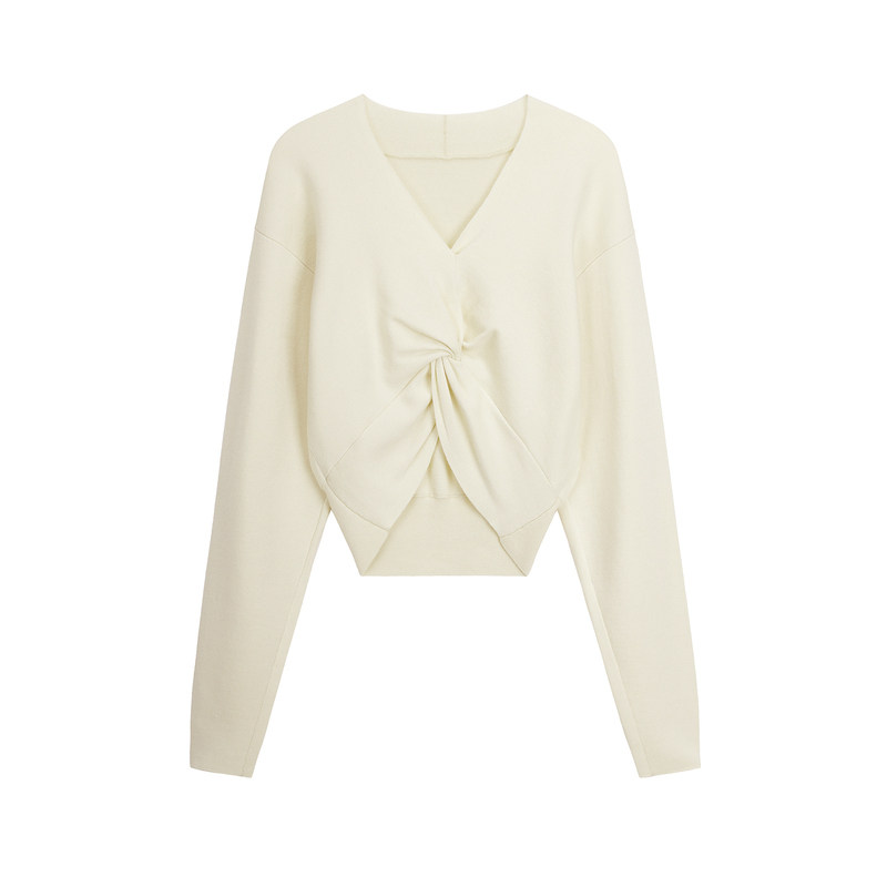 JNBY/江南布衣秋针织衫女短款长袖套头毛衣V领扭结简约纯色上衣