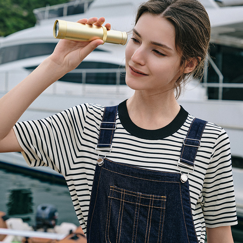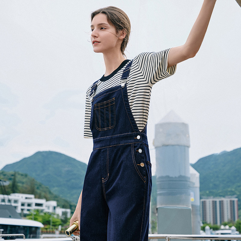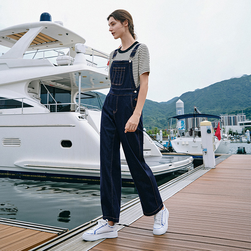 Navigare意大利小帆船蓝色水洗牛仔背带裤女夏季显瘦直筒裤