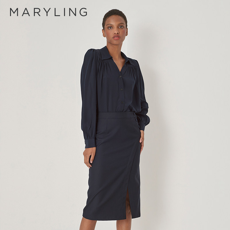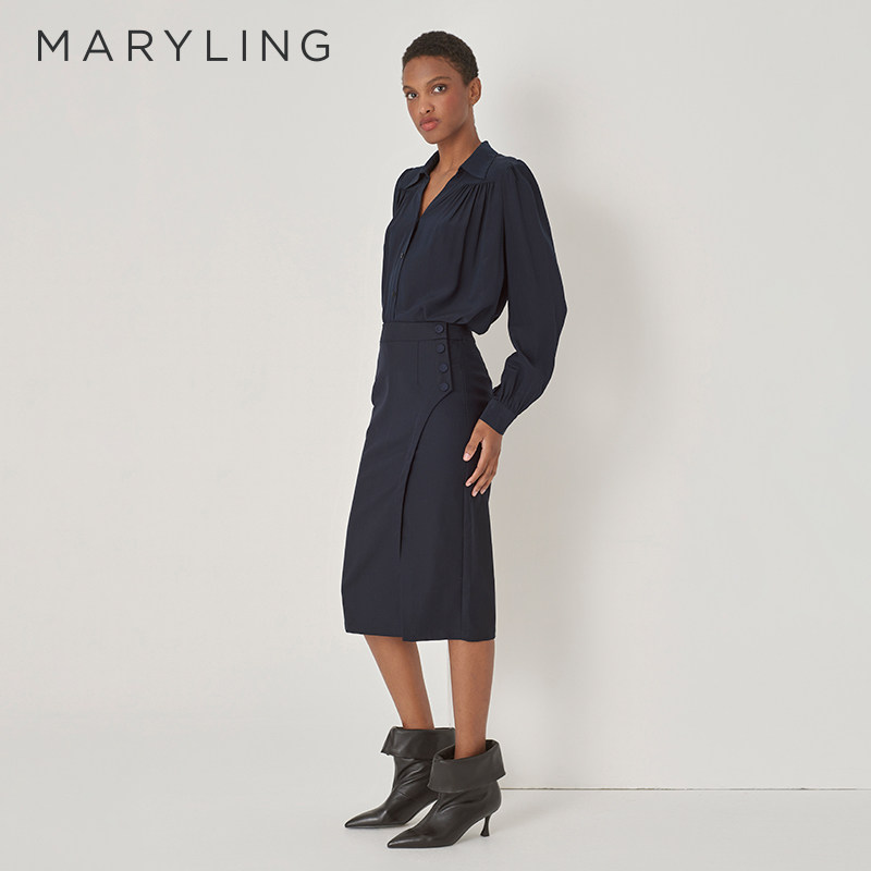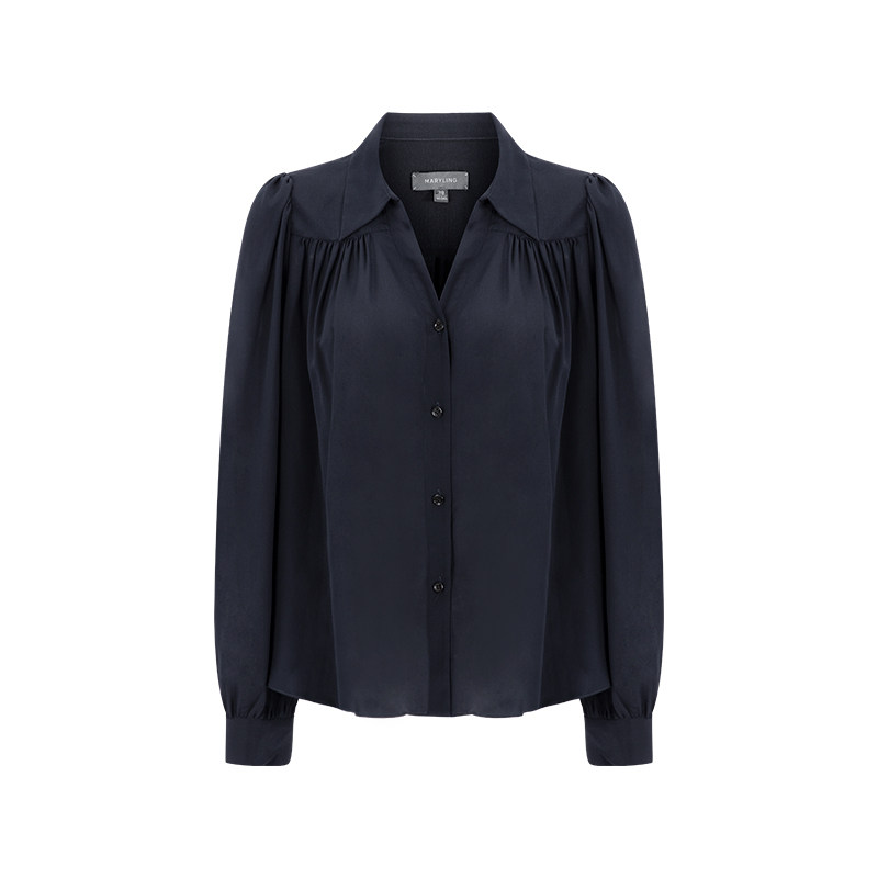 MARYLING玛俪琳初秋新品深蓝V型衬衫领真丝上衣A1DGW20160