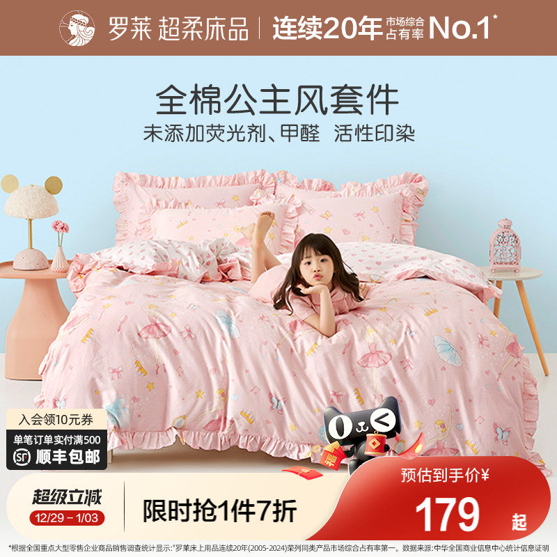 罗莱家纺儿童四件套纯棉女孩床单全棉套件公主风床上用品三件套