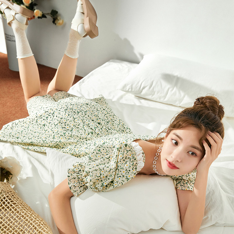 唐狮碎花连衣裙女装夏季吊带裙泡泡袖收腰显瘦修身碎花裙法式气质