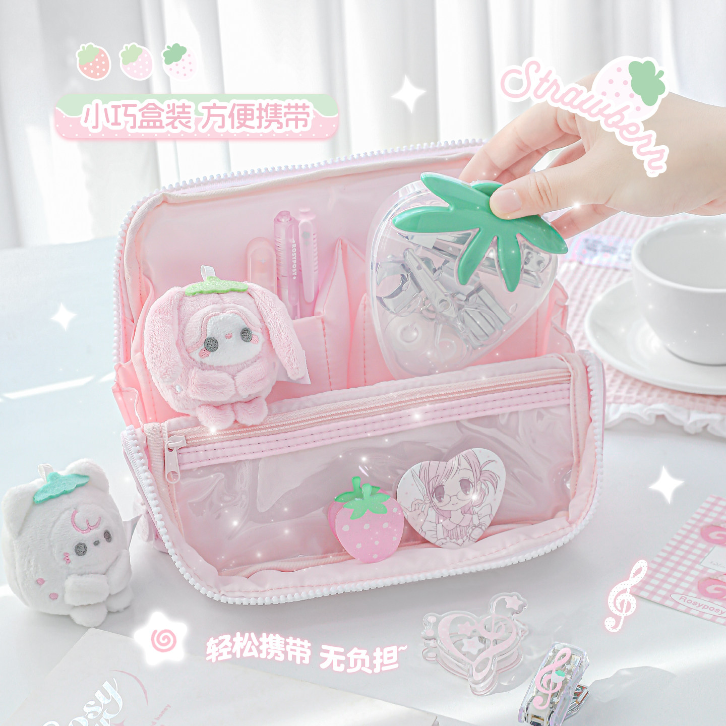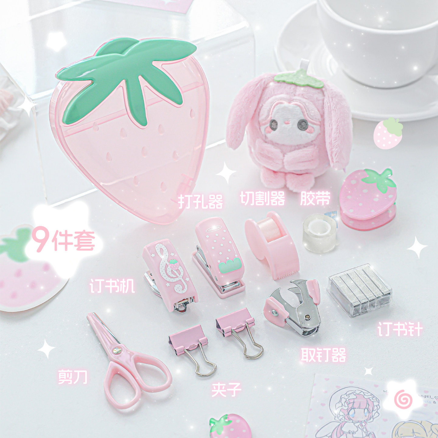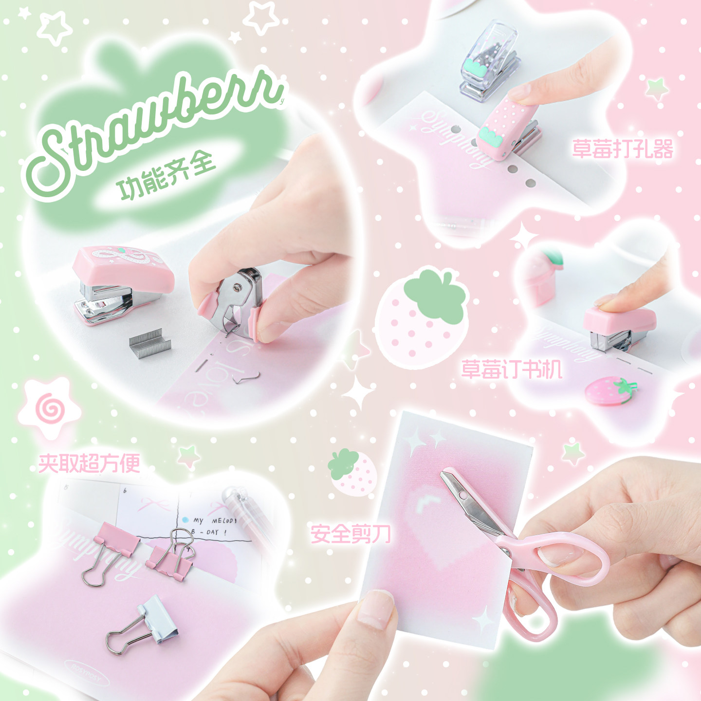 RosyPosy柔设草莓迷你文具套装订书器打孔器小夹子手账学习好物