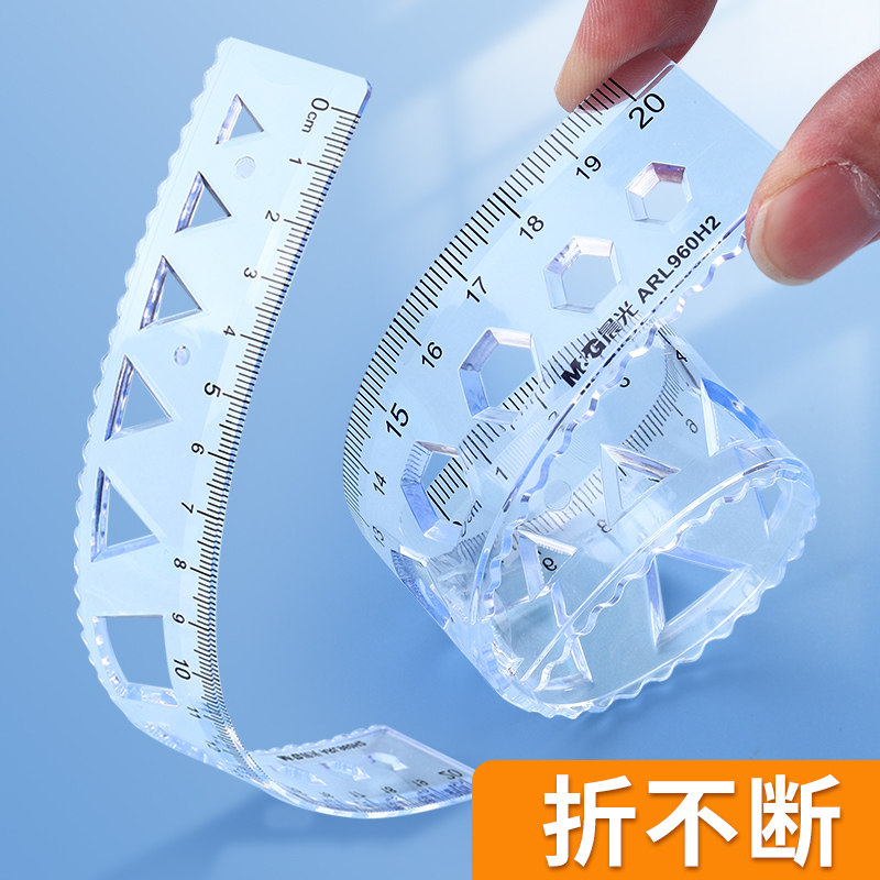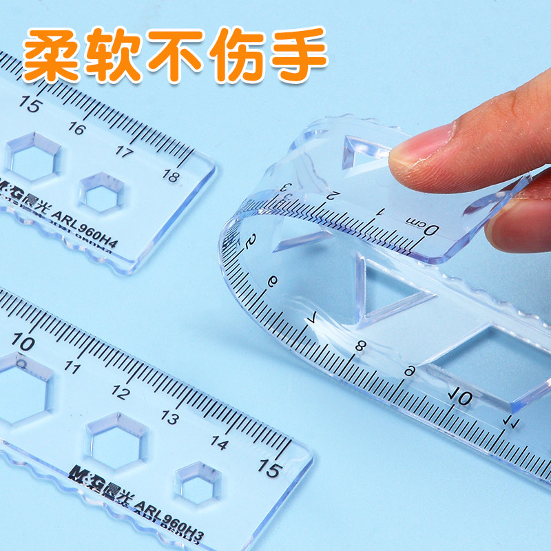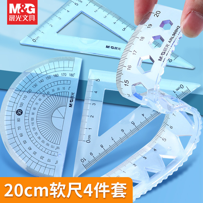 晨光软尺子学生文具软尺套装20cm透明软直尺带波浪线小学生一年级三角尺量角器多功能一套儿童套尺四件套