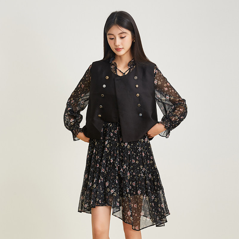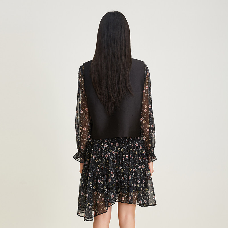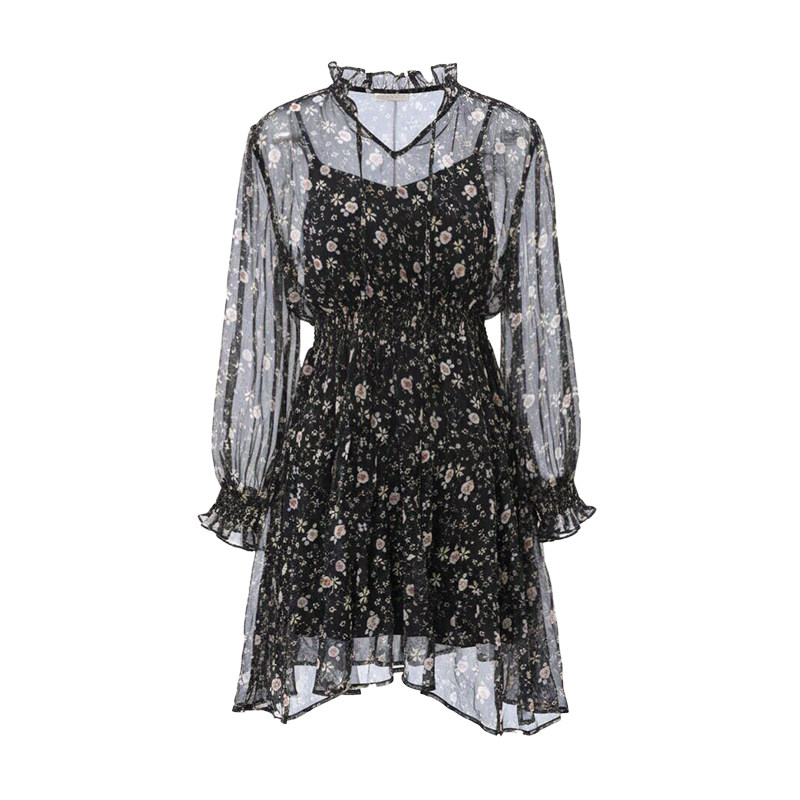 SOMSOM/索玛春季新款黑色碎花收腰花边领不规则雪纺连衣裙两件套
