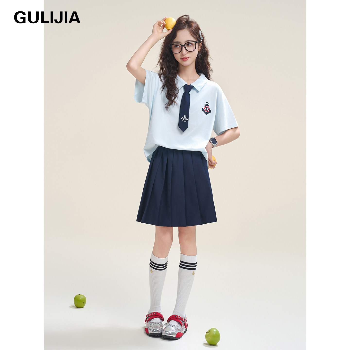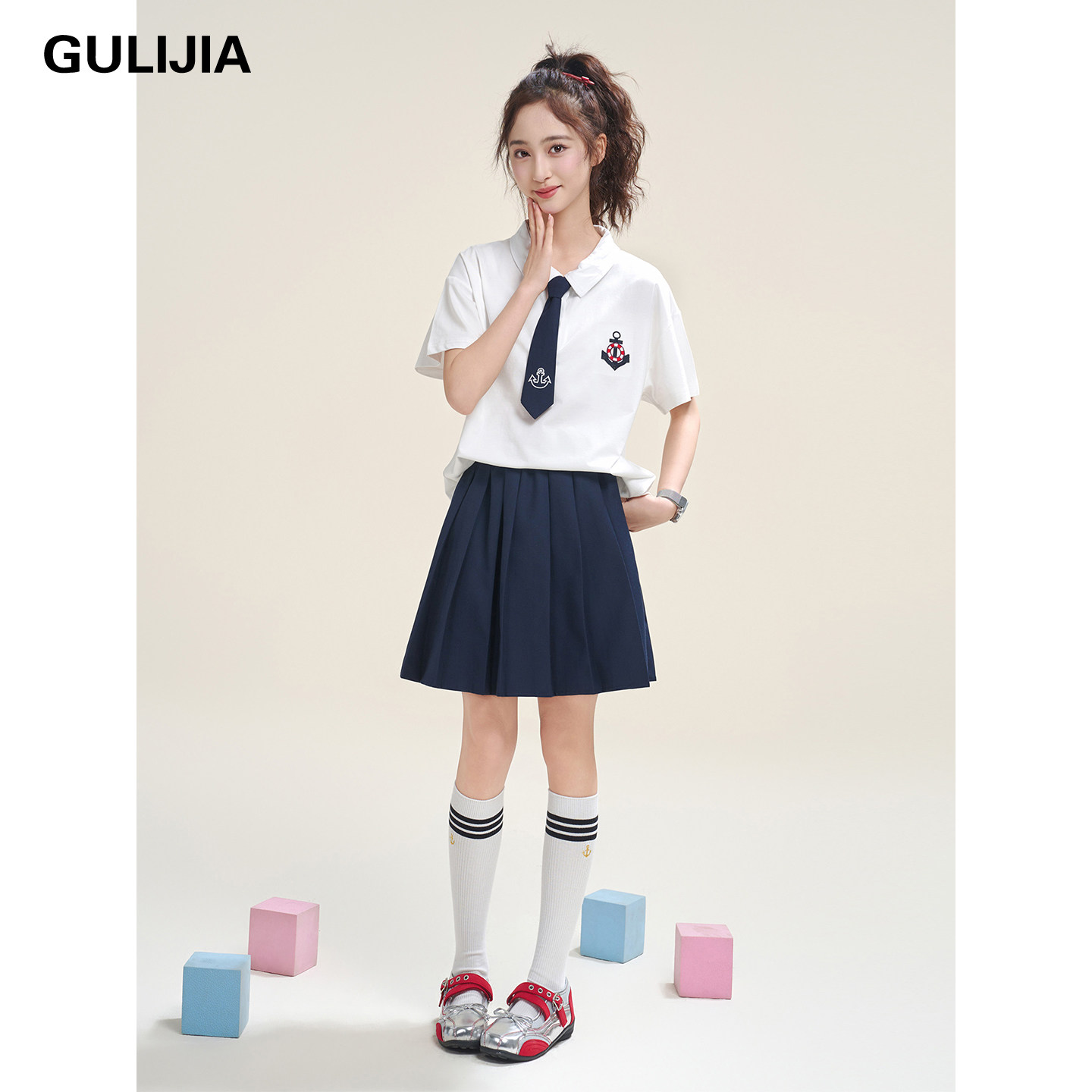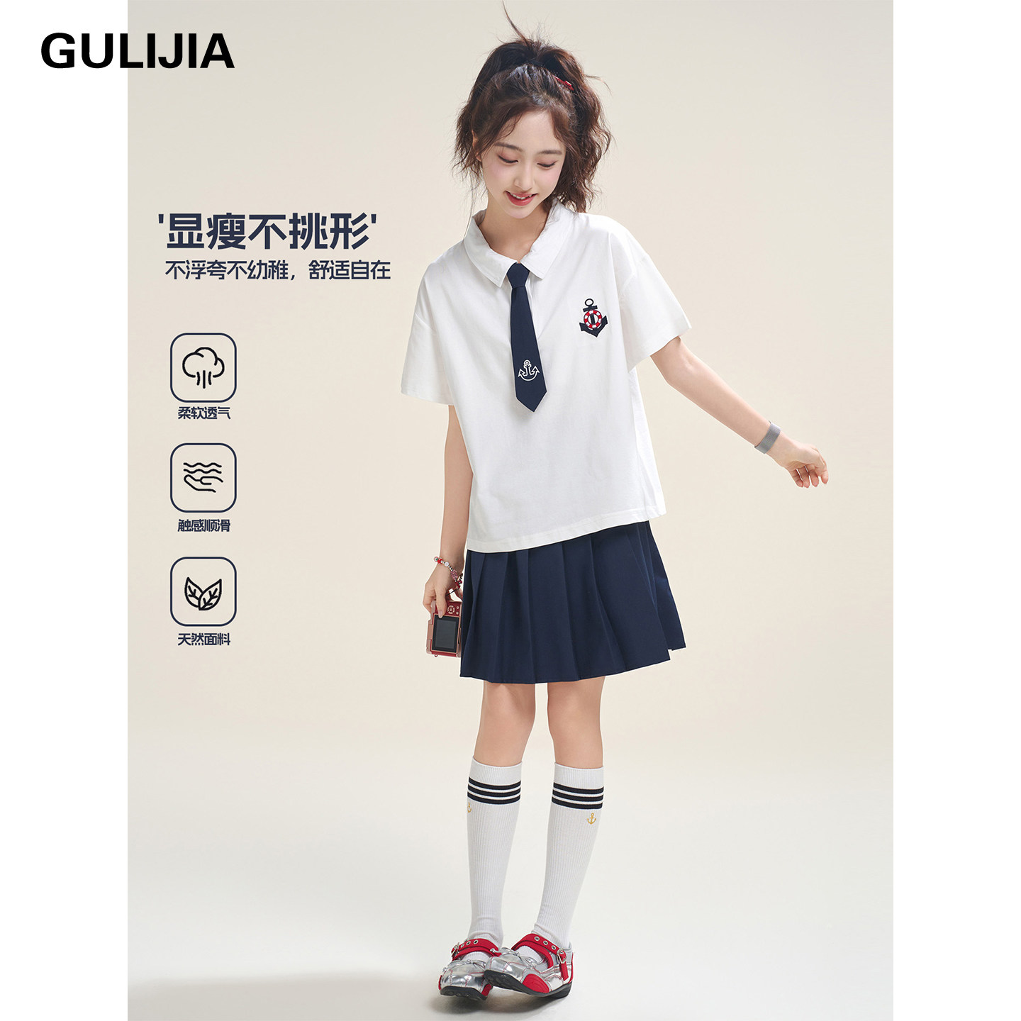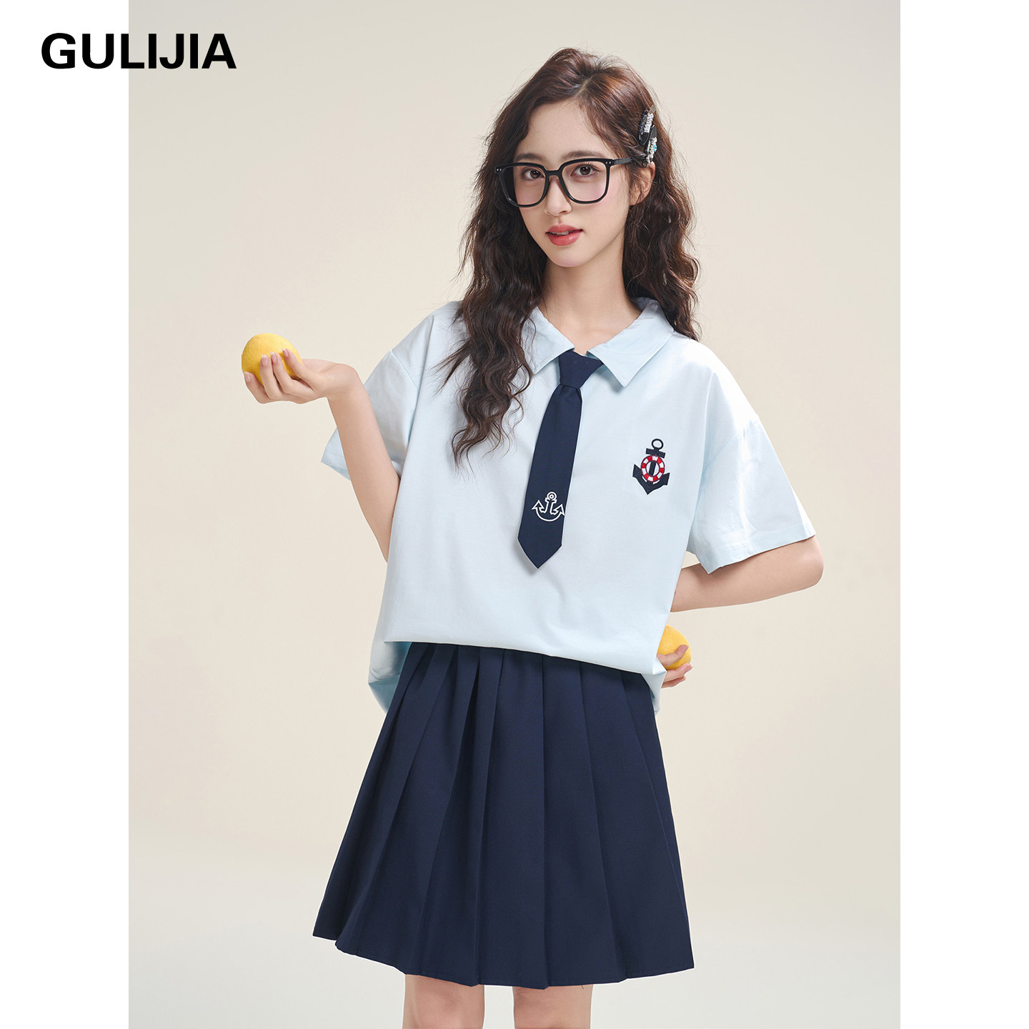 女大童学院风短袖衬衫套装夏季翻领领带百褶裙初中生JK两件套校服