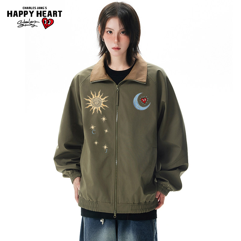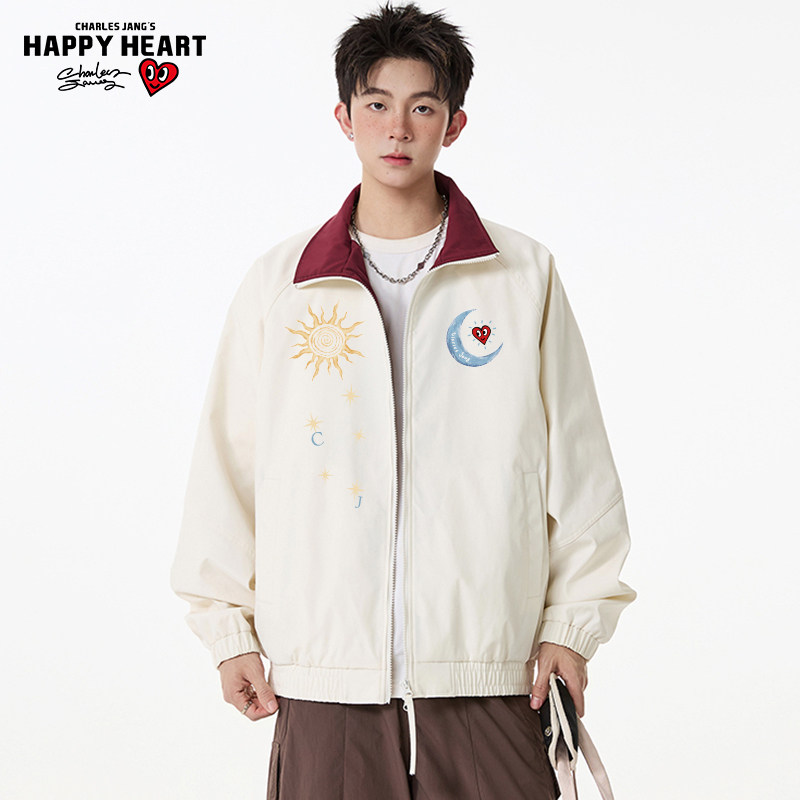 查尔斯桃心 美式日月印花夹克男女春秋季立领休闲运动情侣款外套