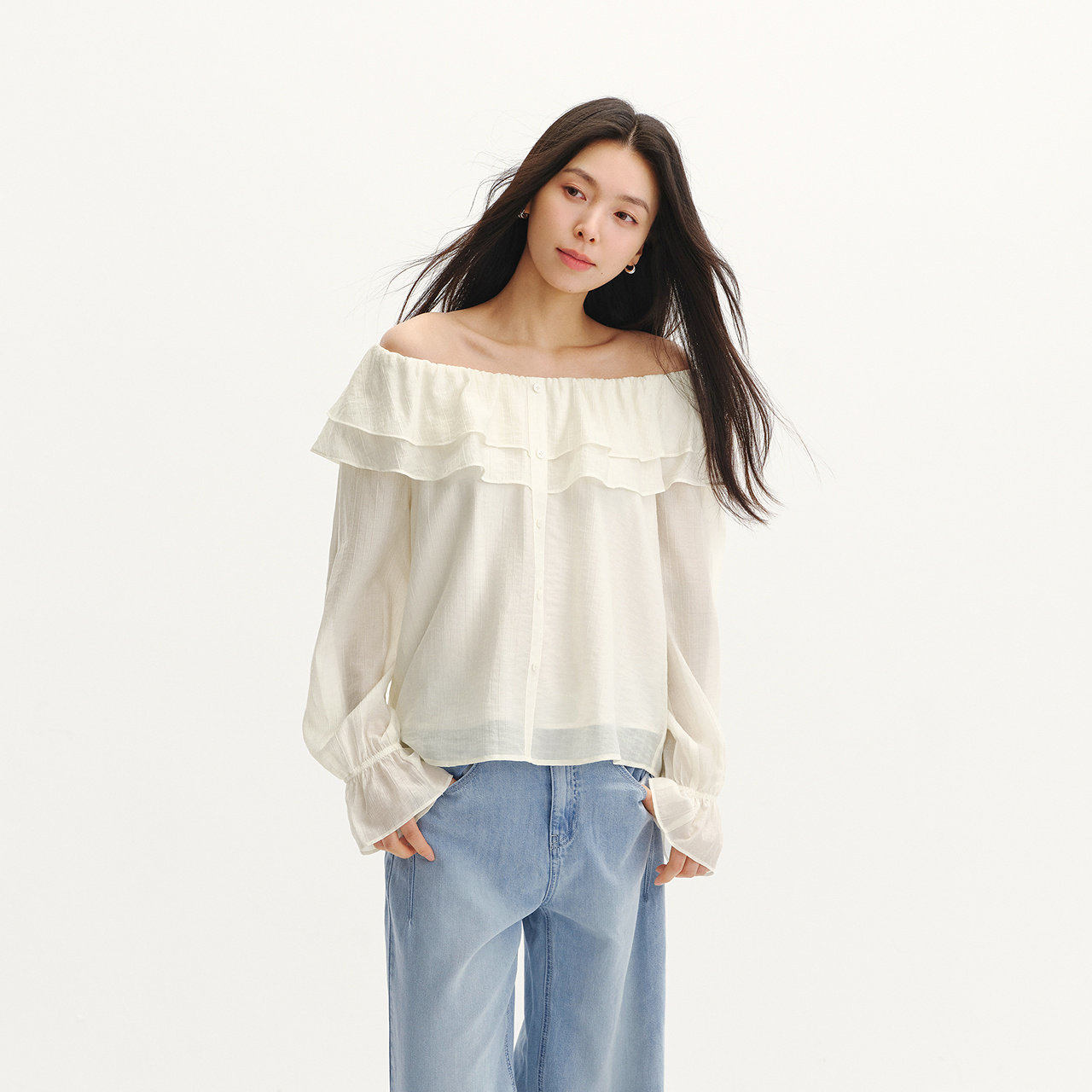 MAMC灯笼袖暗纹白色衬衫女2024新款修身独特小众设计感一字肩上衣