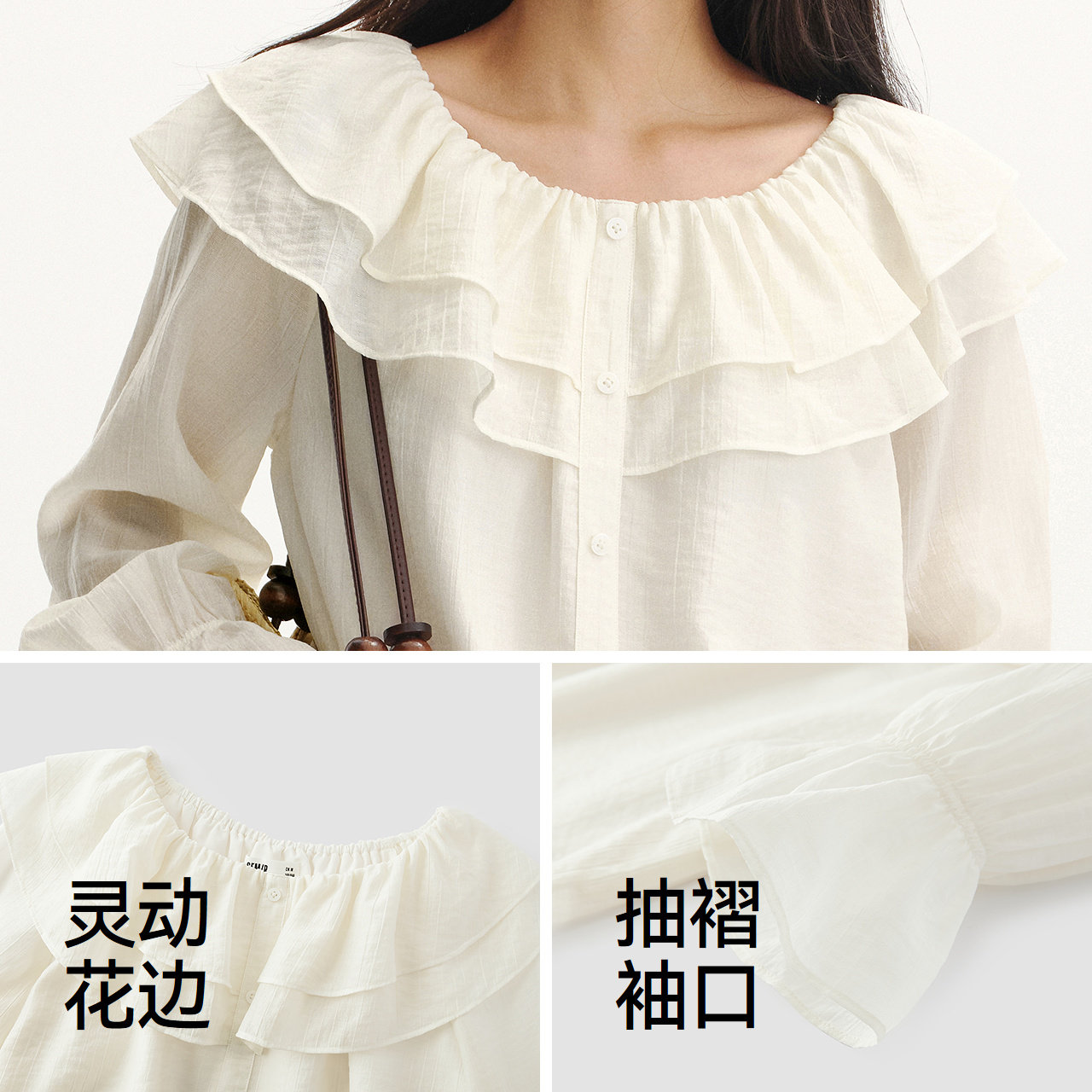 森马长袖衬衫女夏季荷叶边灯笼袖肌理2026新款小个子甜美法式衬衣
