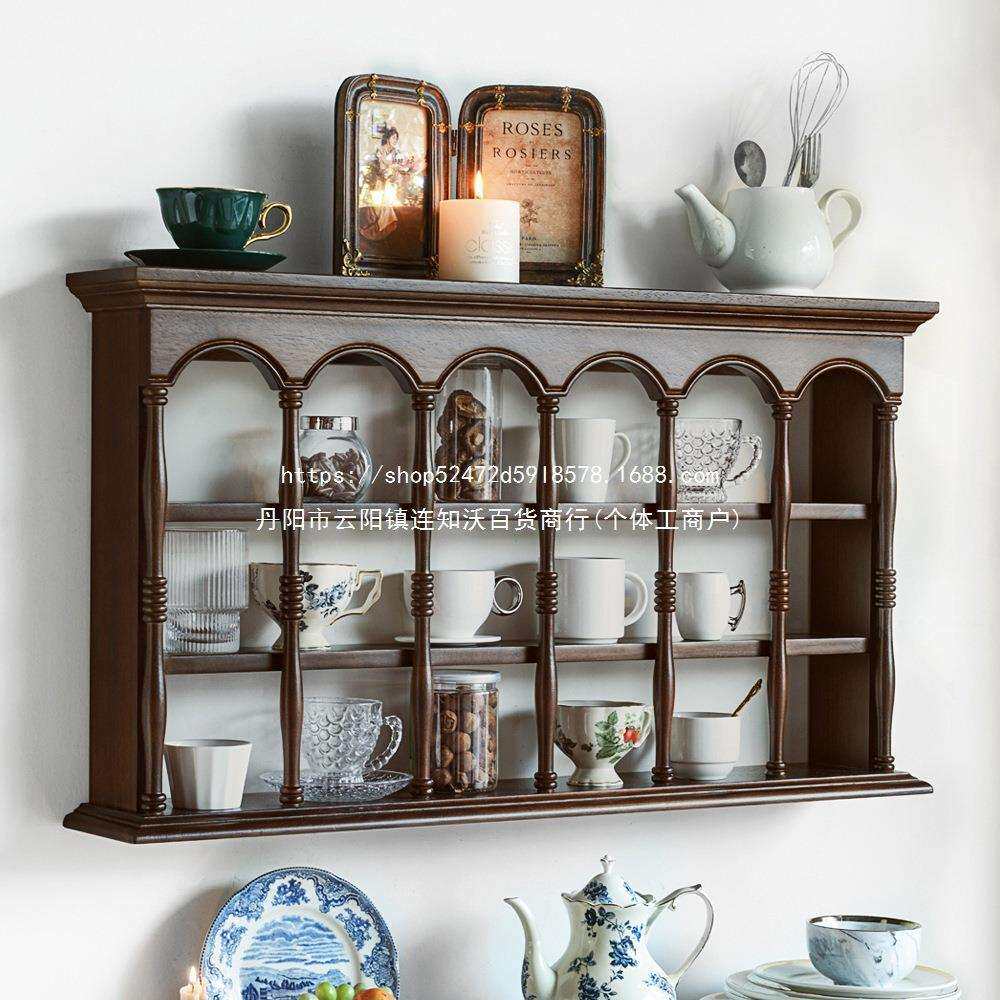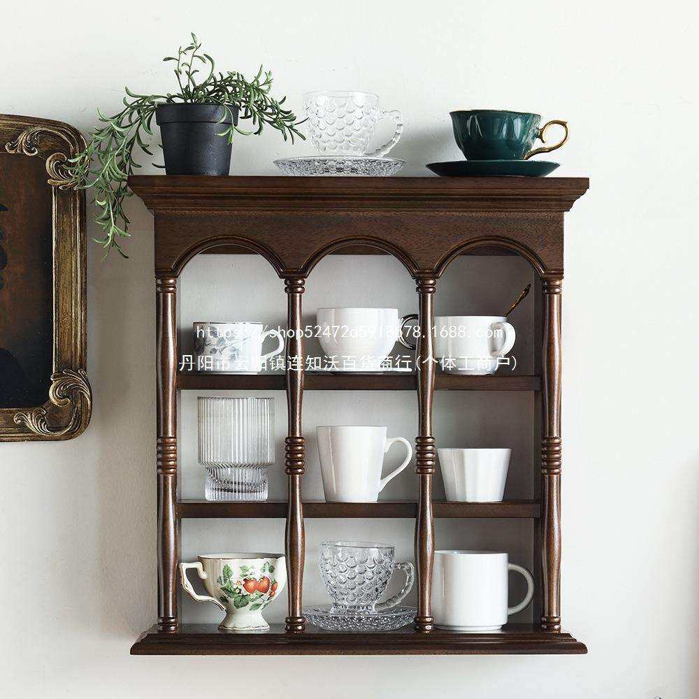 美式实木杯架复古餐桌置物墙壁吊柜中古咖啡杯展示柜三层挂墙架
