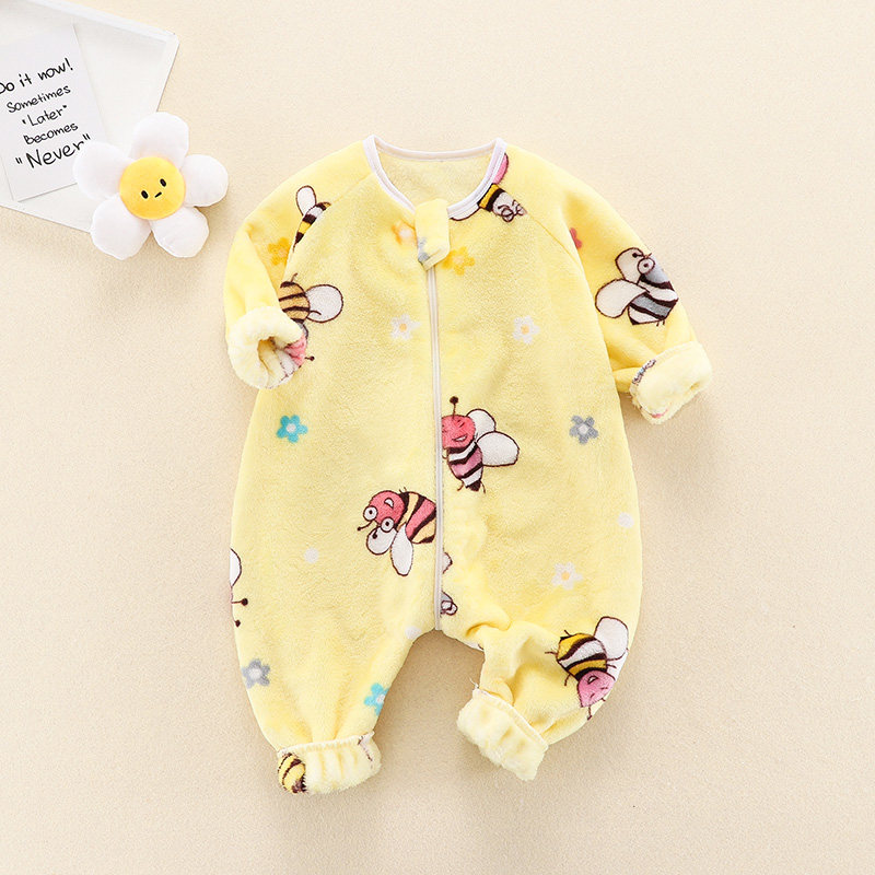 男女宝宝儿童家居服防踢被秋冬法兰绒婴儿双面绒连体睡衣小蜜蜂