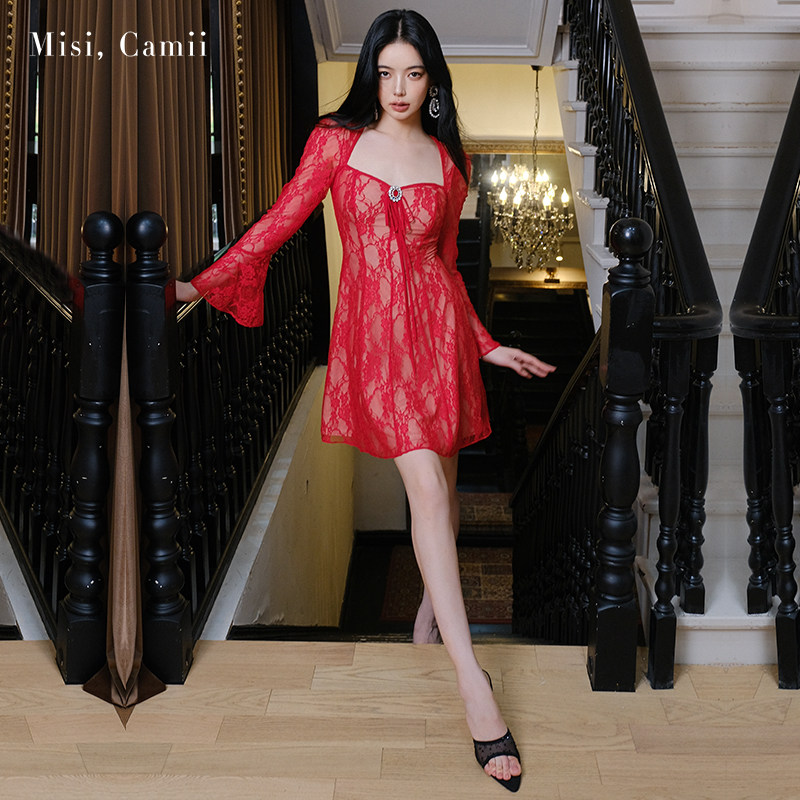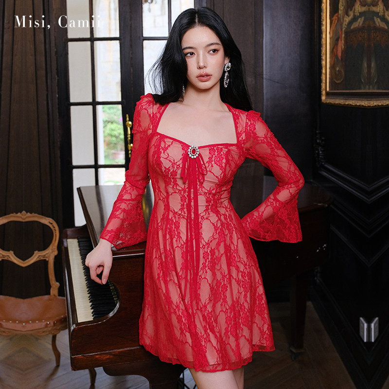Misi.Camii2025早秋新款复古蝴蝶结蕾丝连衣裙高端时尚感轻奢女装