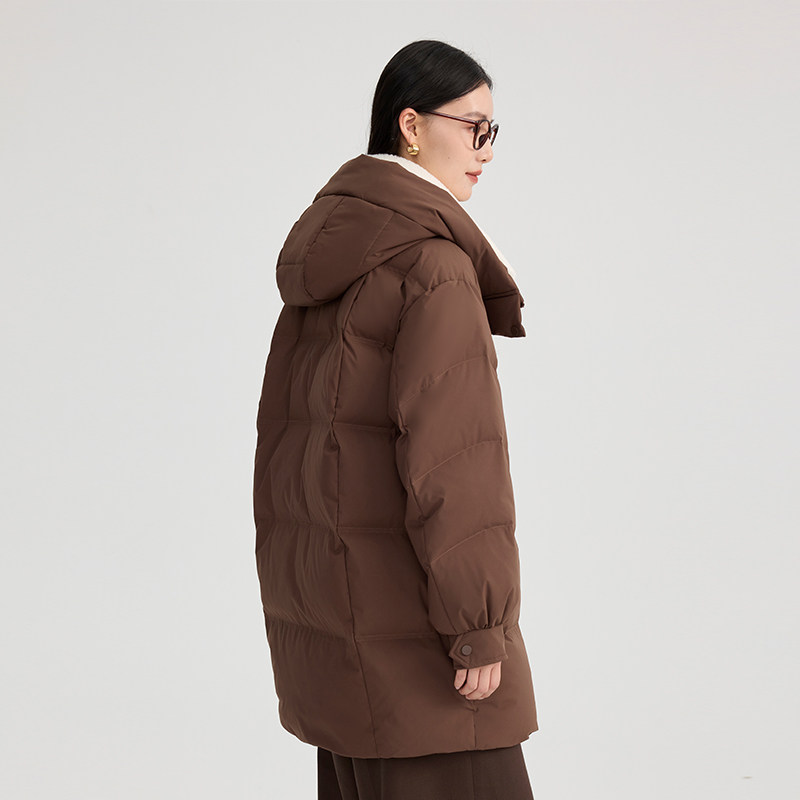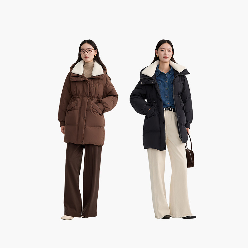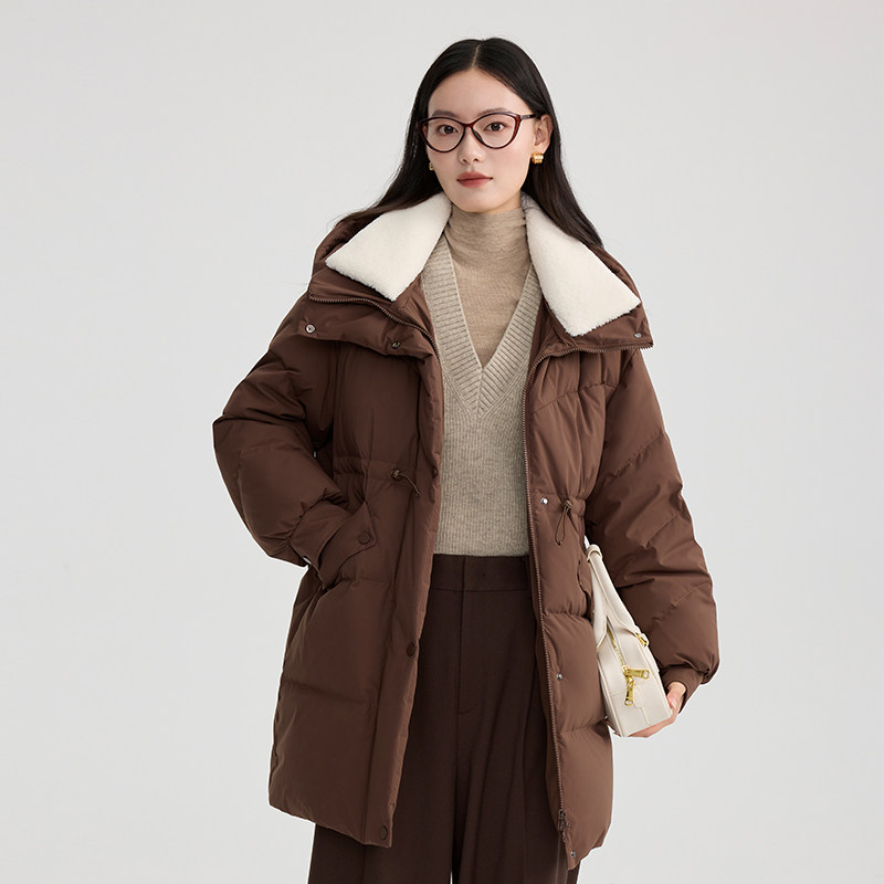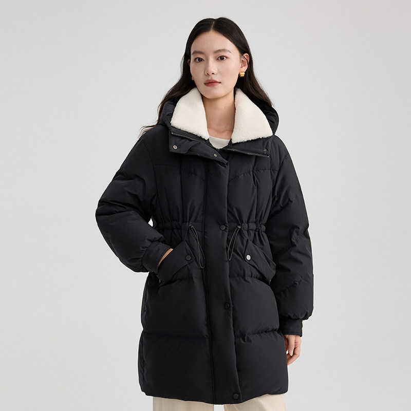 艾莱依新款防羊羔毛领羽绒服时尚简约防风保暖包容性佳中长款外套