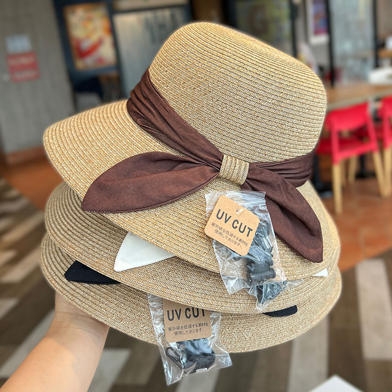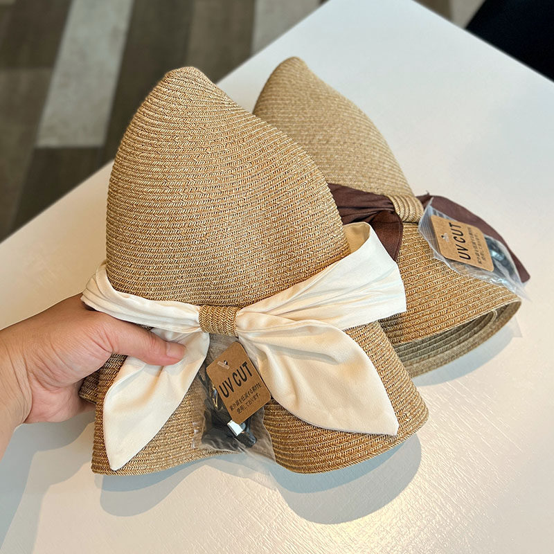 赫本风法式蝴蝶结草帽女出游可折叠大檐遮阳帽夏季户外草编渔夫帽